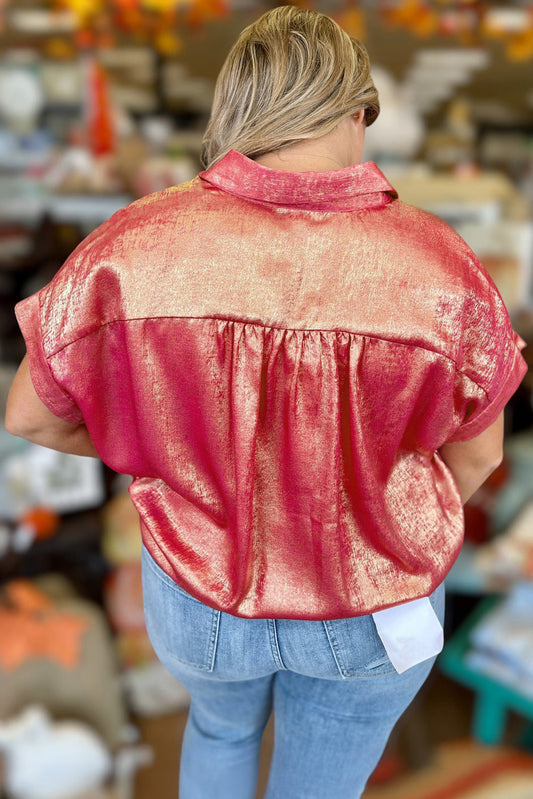 Rose Red Plus Size Metallic Sheen Short Sleeve Button Up Shirt