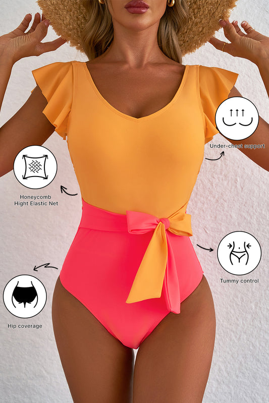 Vitality Orange Color Block Ruffled Knotted Backless One Piece Swimsuit