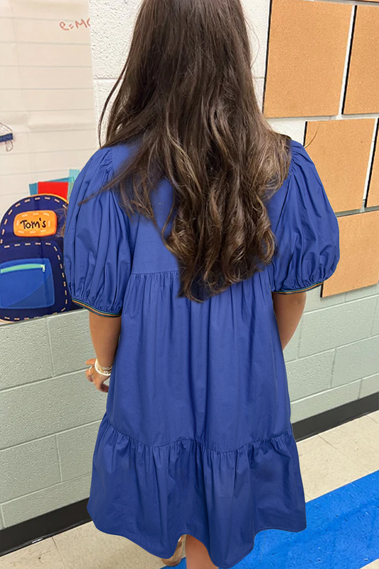 Bluing Colorful Striped Trim Puff Sleeve Pleated Mini Dress