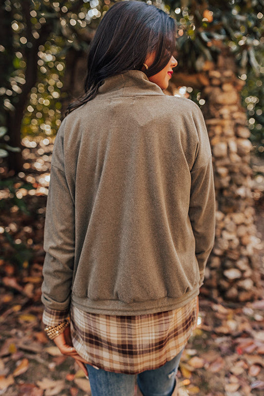 Breen Plaid Patchwork Knotted Hem High Neck Blouse