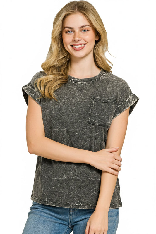 Zenana Full Size Crinkle Washed Round Neck Folded Short Sleeve Tee Plus Size