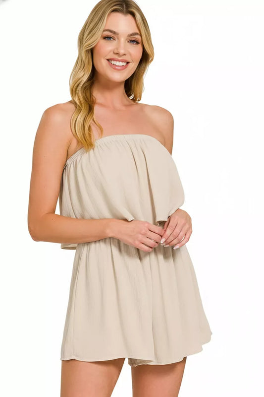 Zenana Woven Crinkle Strapless Rompers