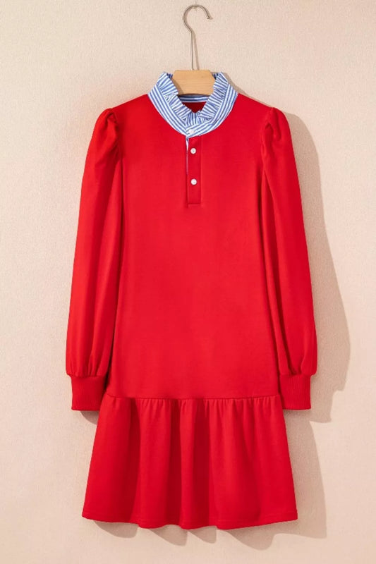 Contrast Striped Collar Patchwork Puff Sleeve Ruffle Hem Mini Dress