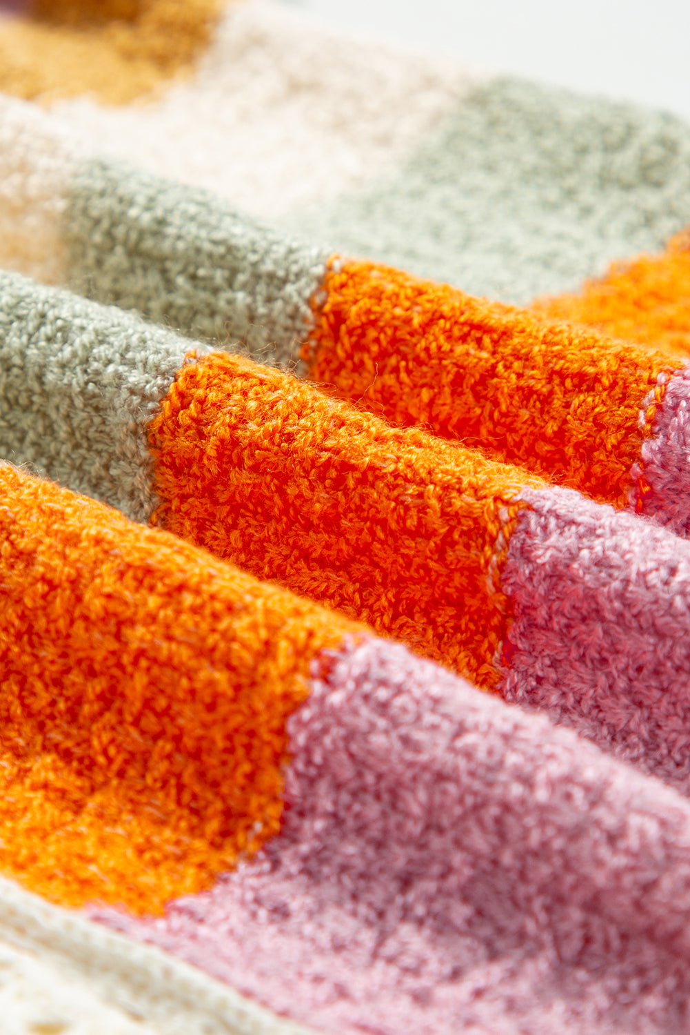 Beige Pointelle Knit Colorblock Patchwork V Neck Hooded Plus Sweater