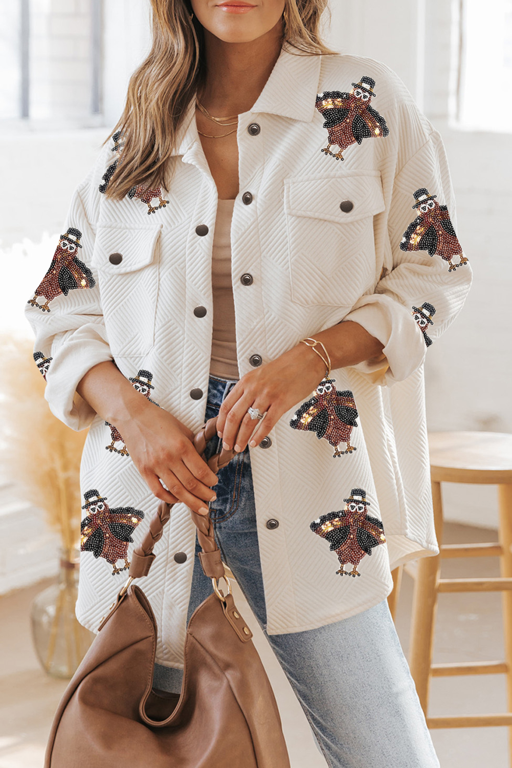 Beige Sequin Turkey Patched Graphic Flap Pocket Textured Shacket