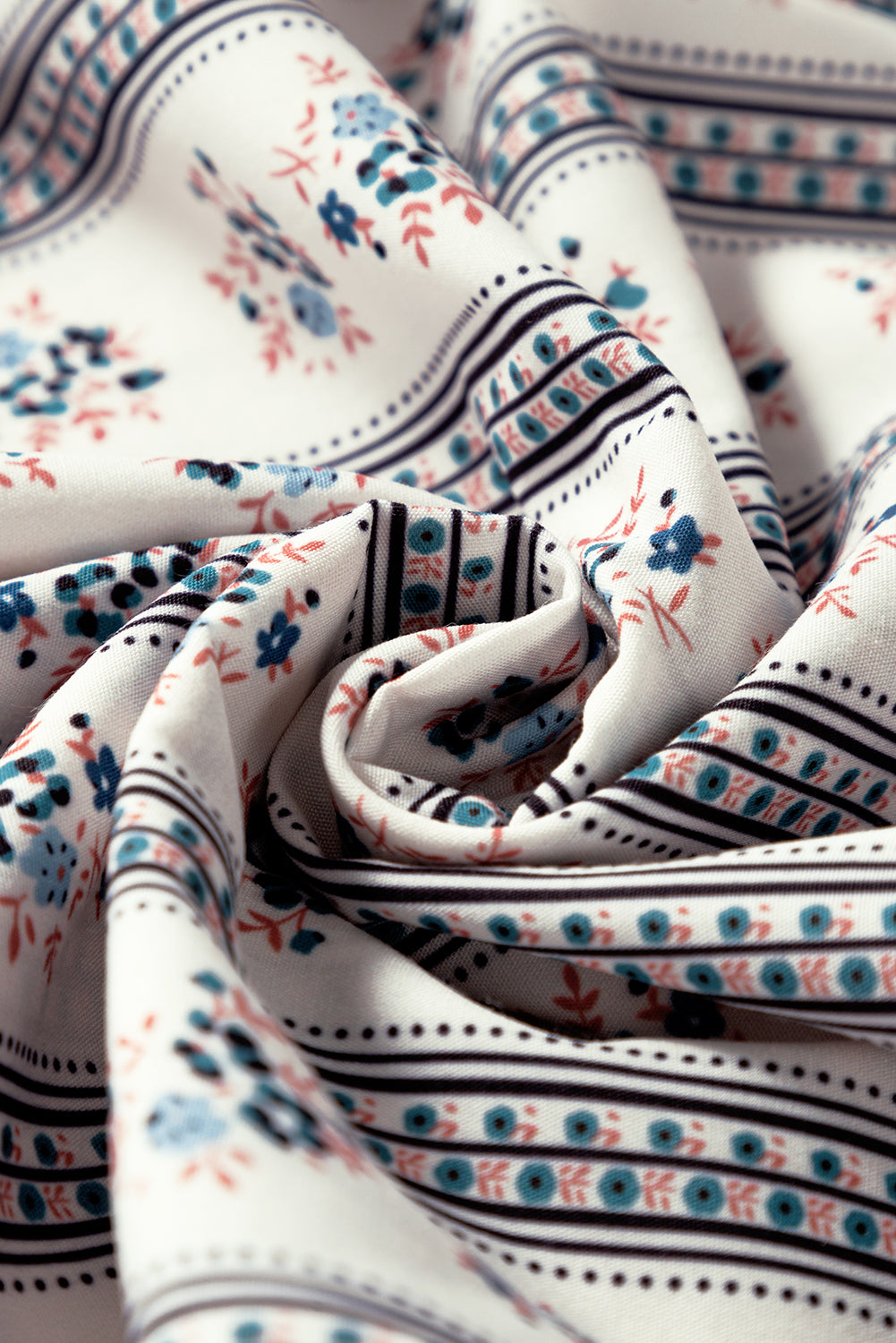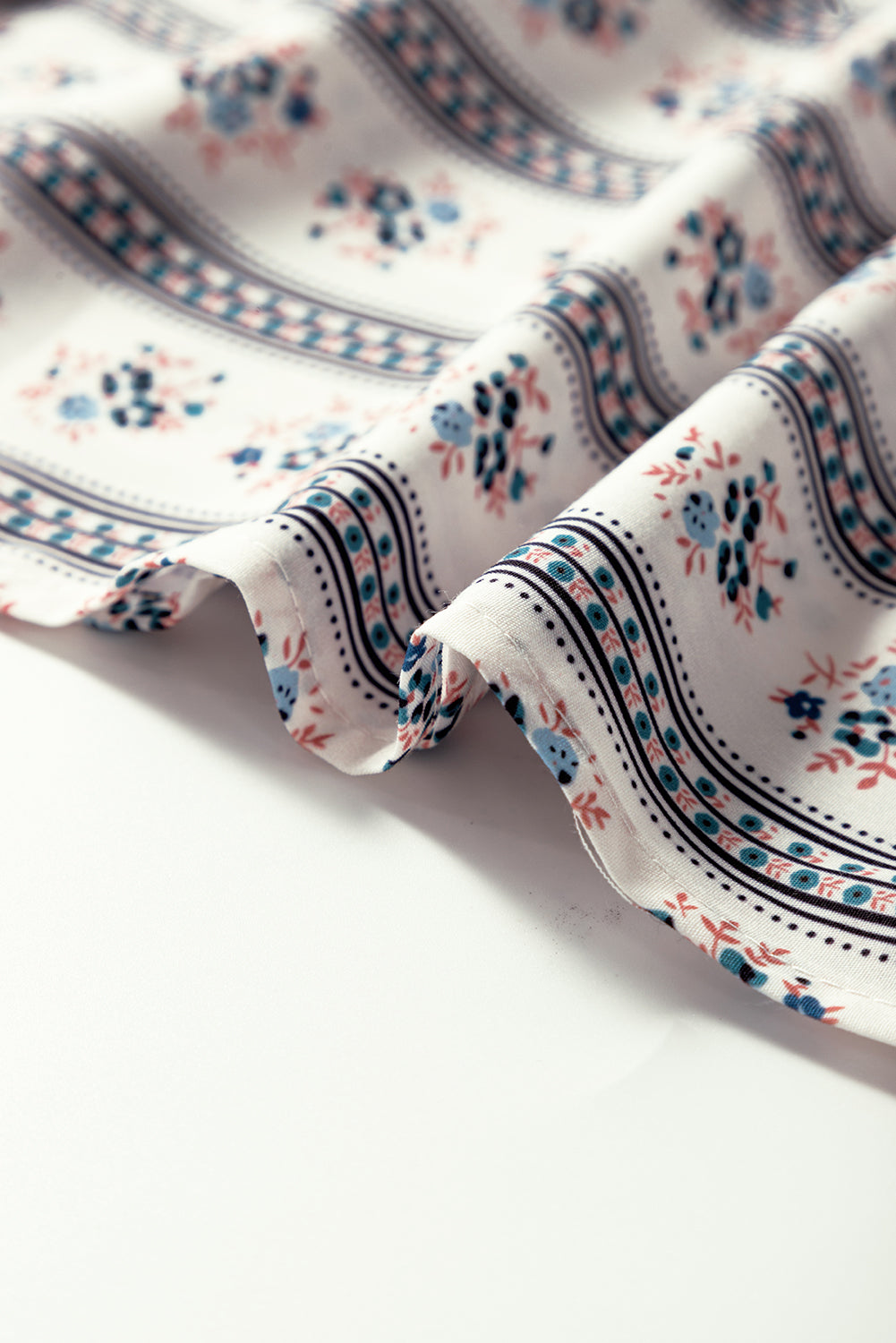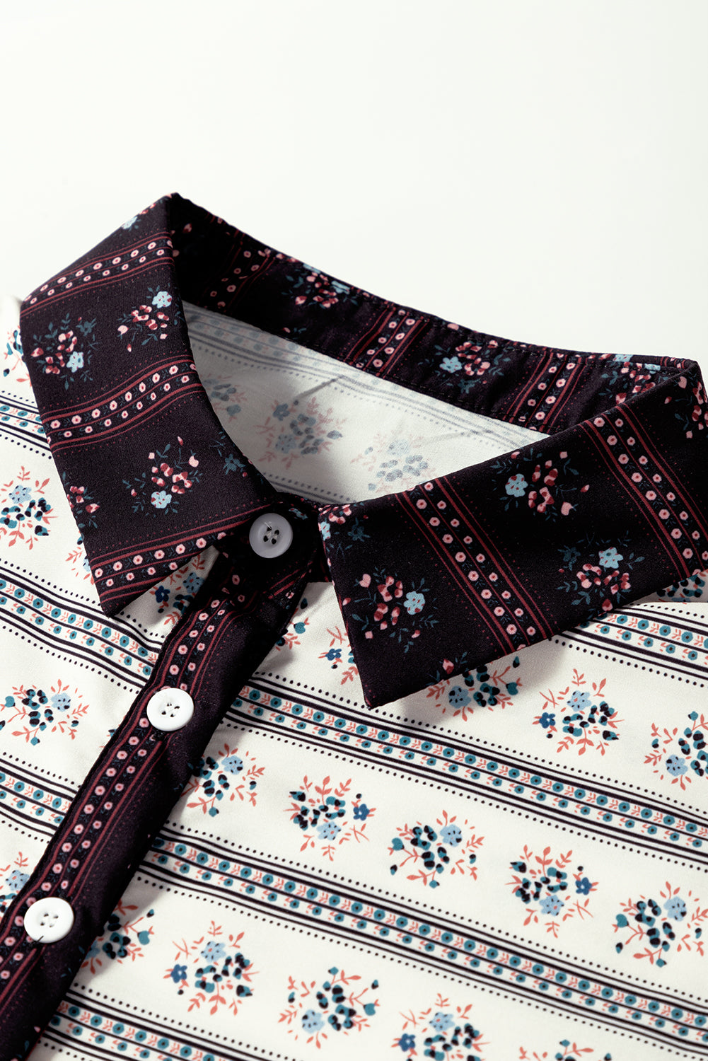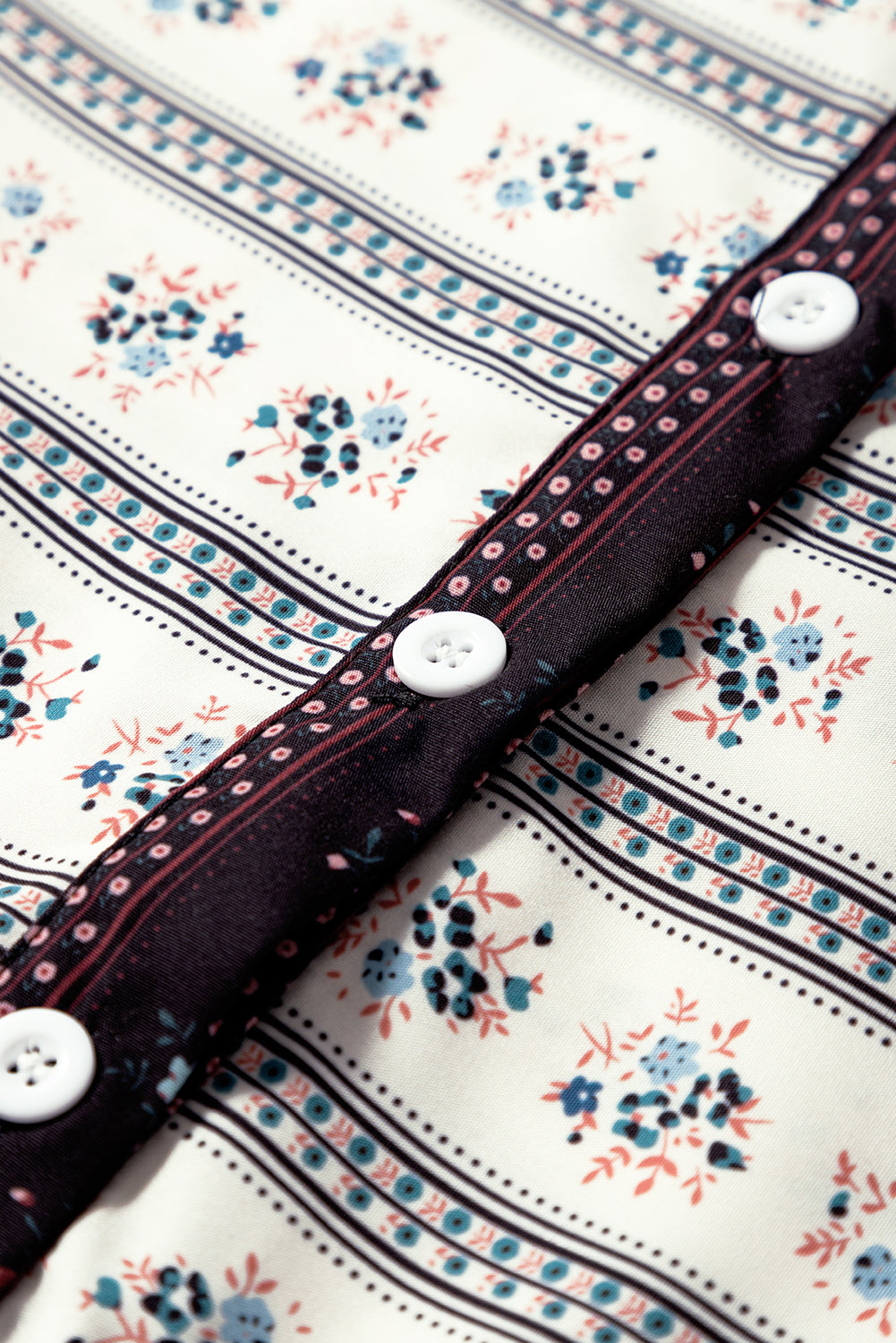 Black Boho Floral Striped Contrast Trim Bubble Sleeve Flared Dress
