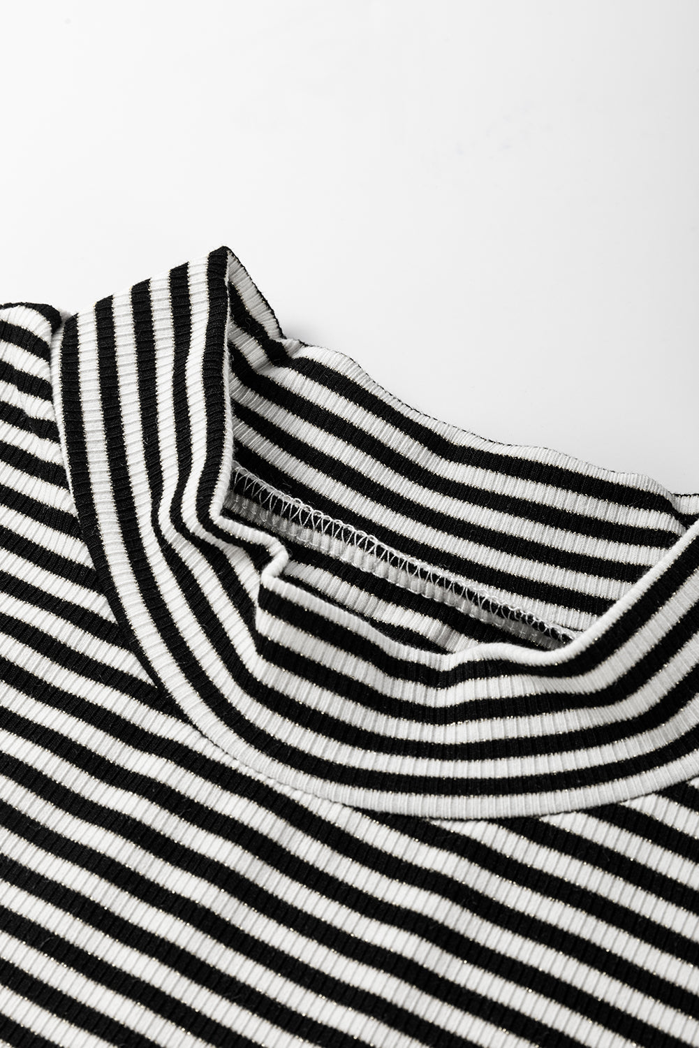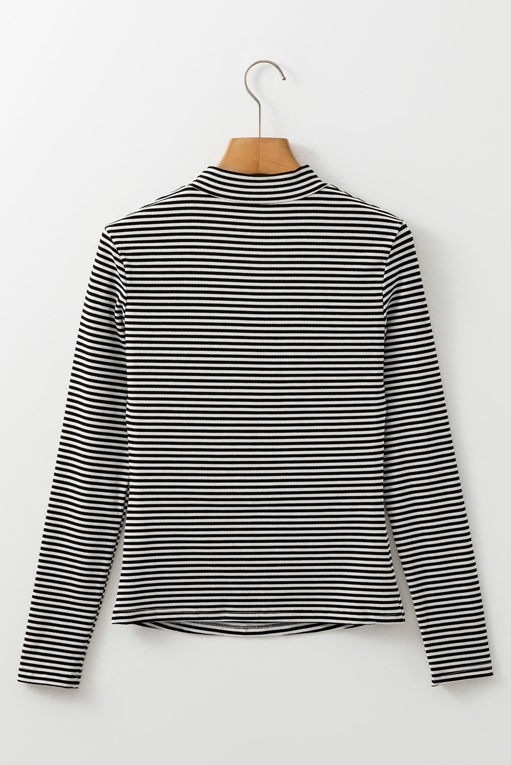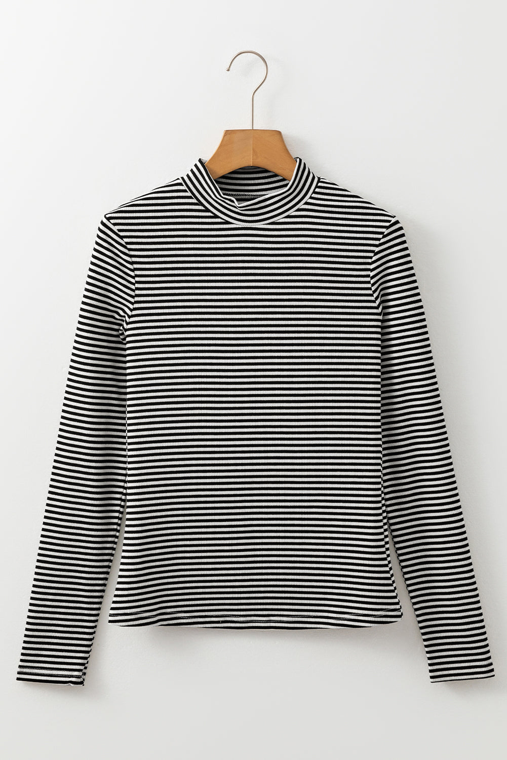 Black Stripe Knit Mock Neck Long Sleeve Slim Top