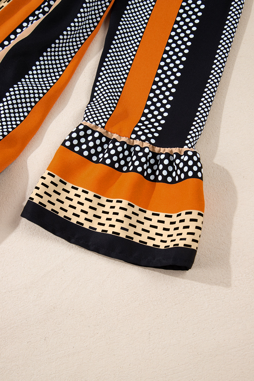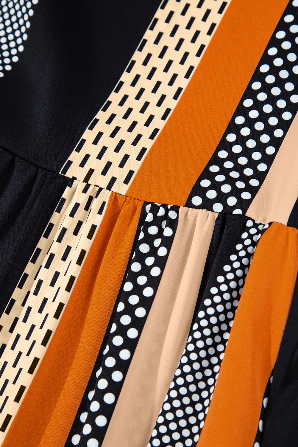 Black Striped Polka Dot Print Ruffled Hem V Neck Mini Dress