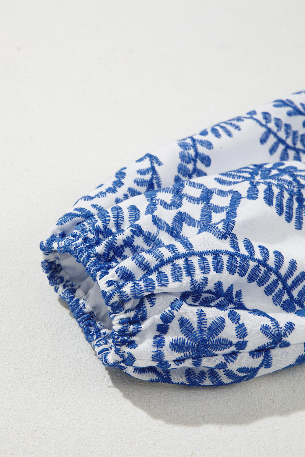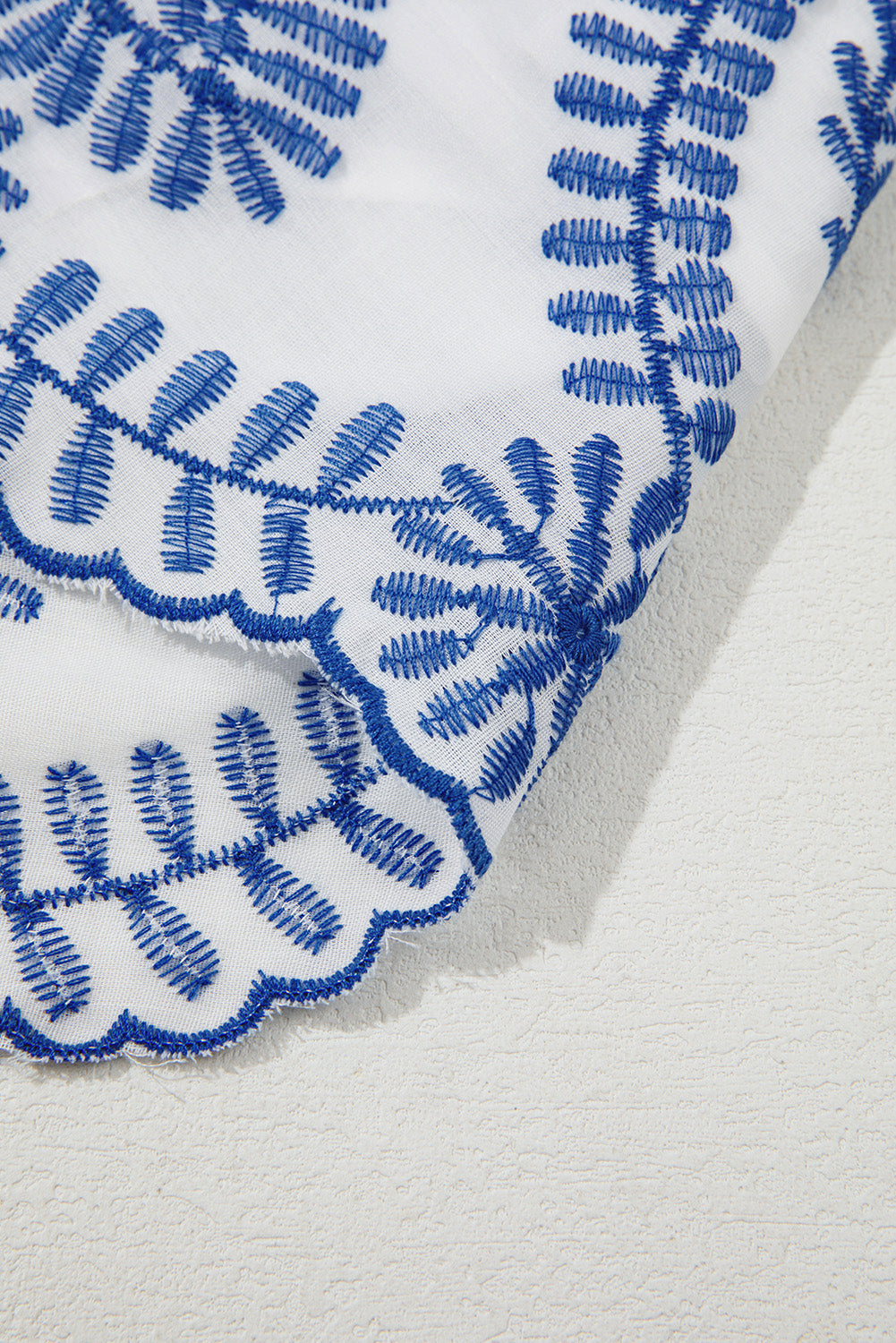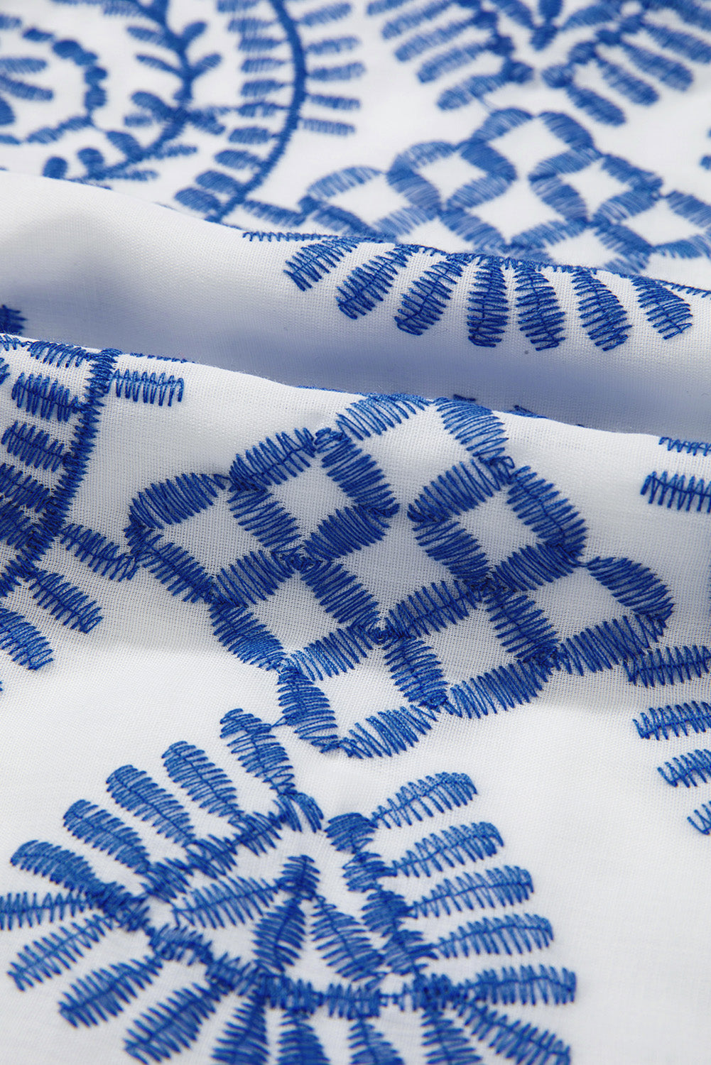 Blue Boho Floral Embroidered Notch V Neck Shift Mini Dress