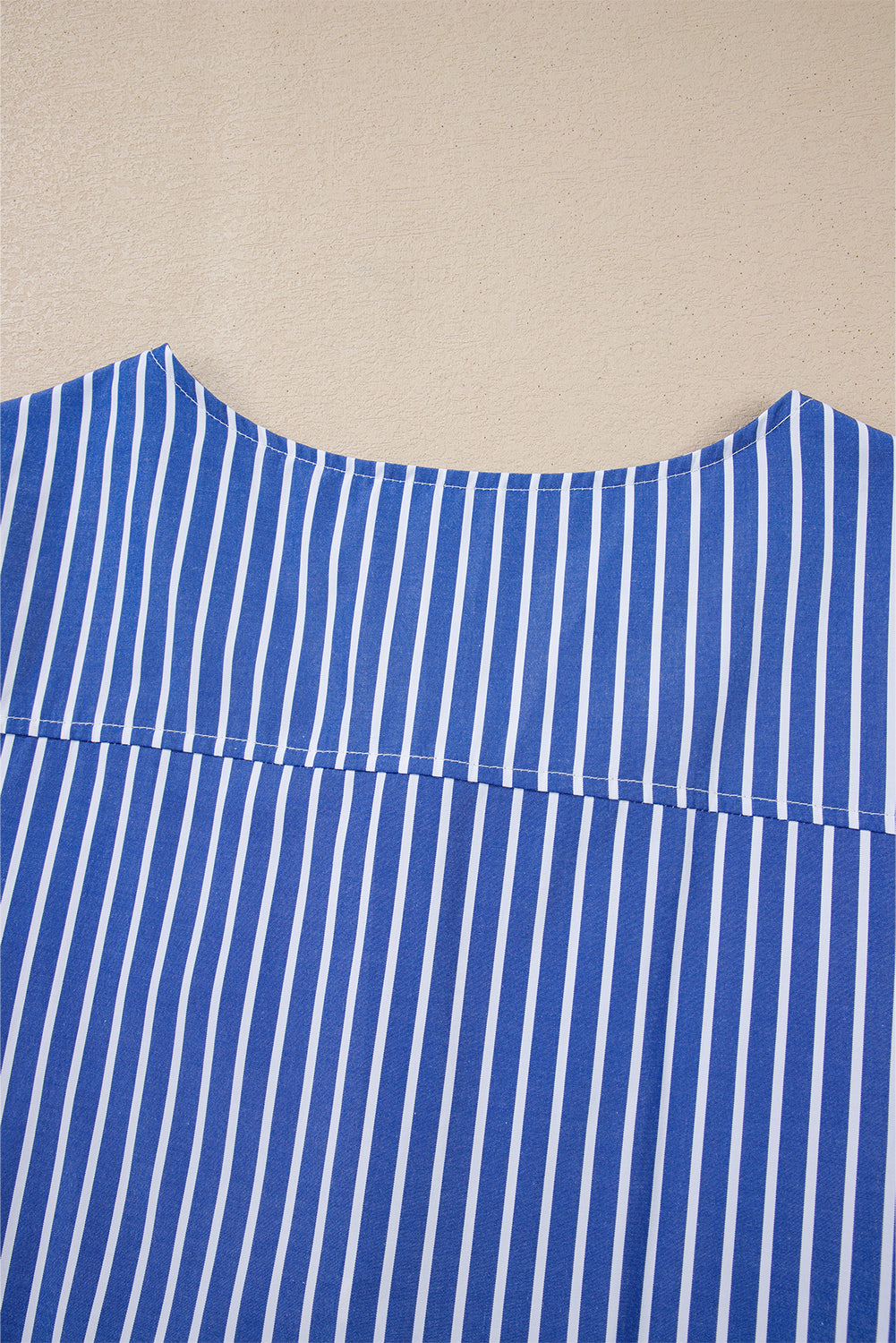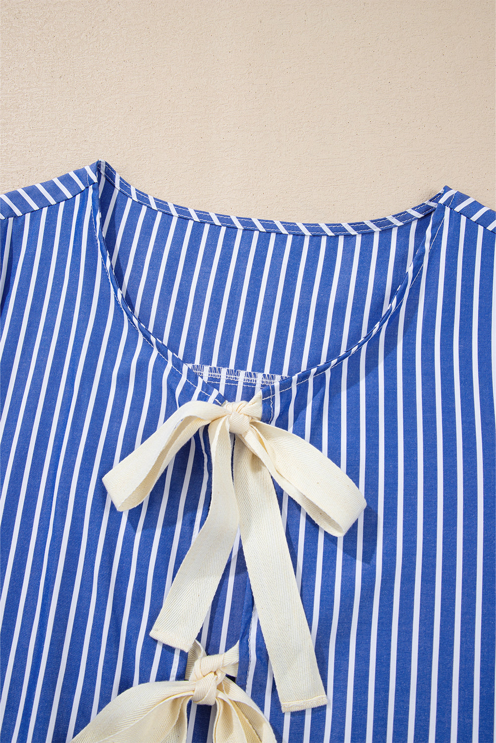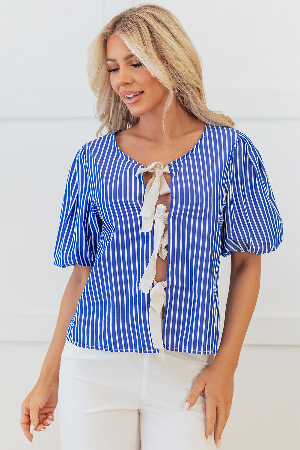 Blue Stripe Tied Front Puff Short Sleeve Blouse
