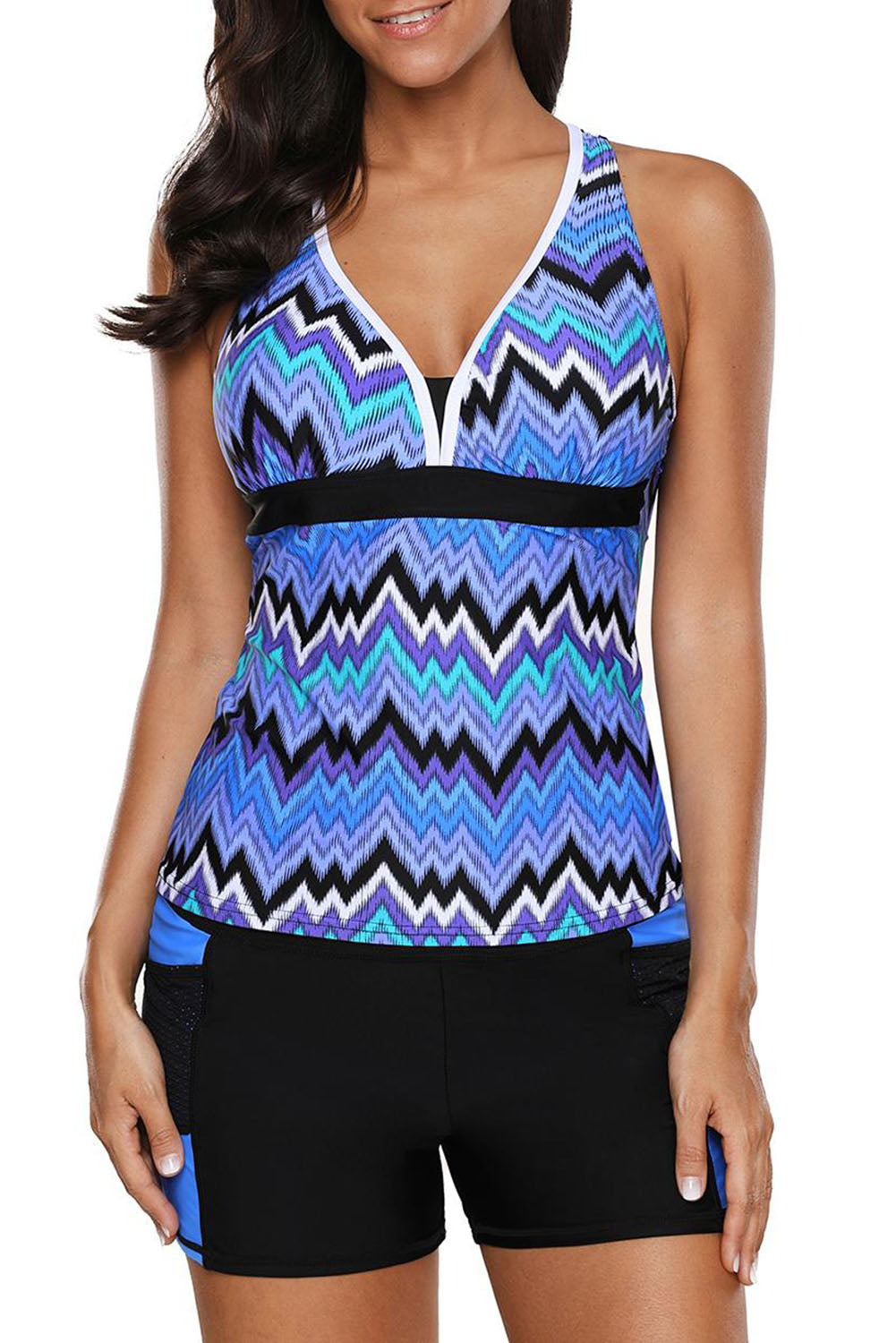 The multicolor tankini top design is to make you the most attention-getting person on the beach. The bra structure with black band underbust contours a proud breast curve, racerback design and slim fit silhouette cut. Hollow-out mesh and contrast color splicing swim bottom included for a complete workout style.