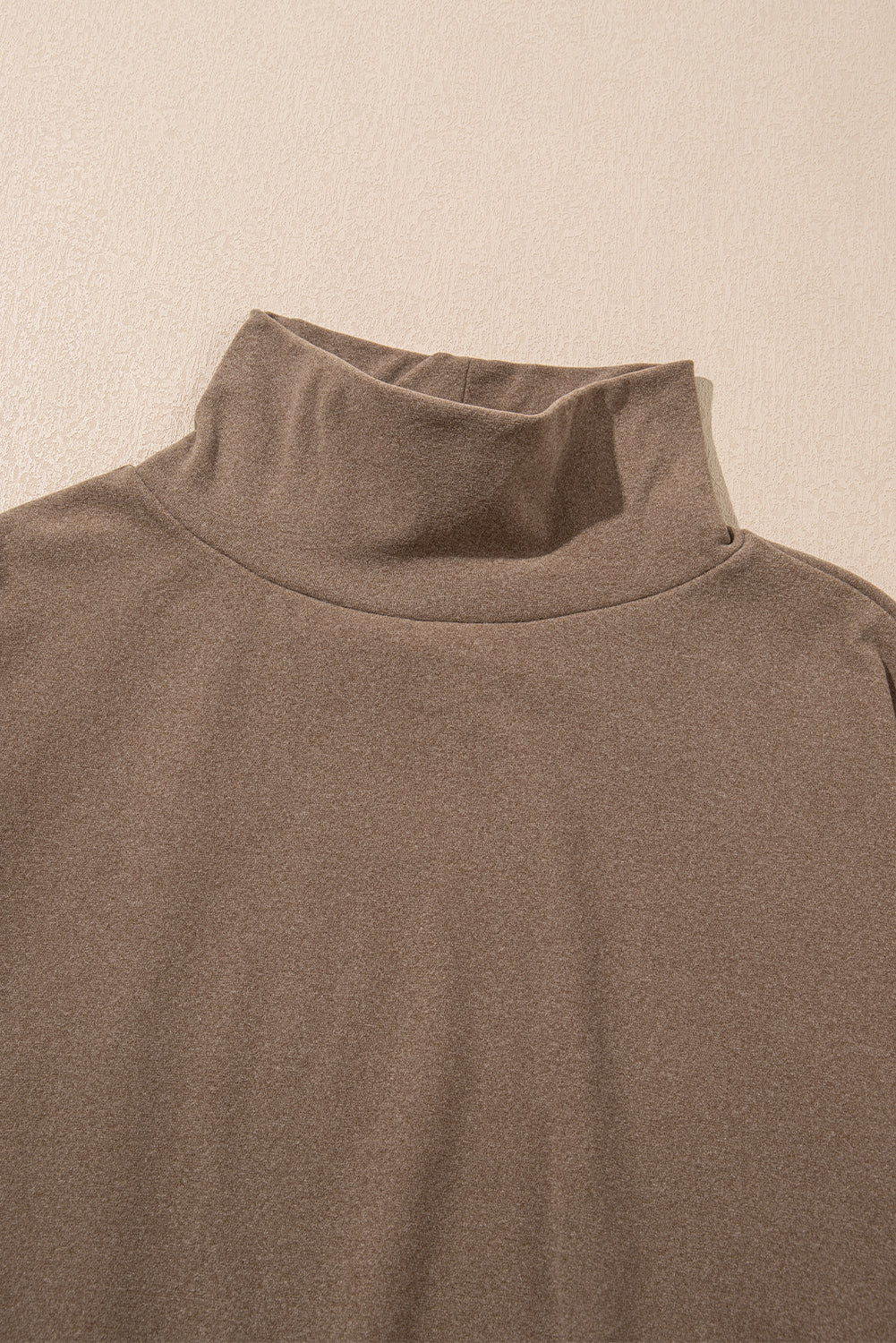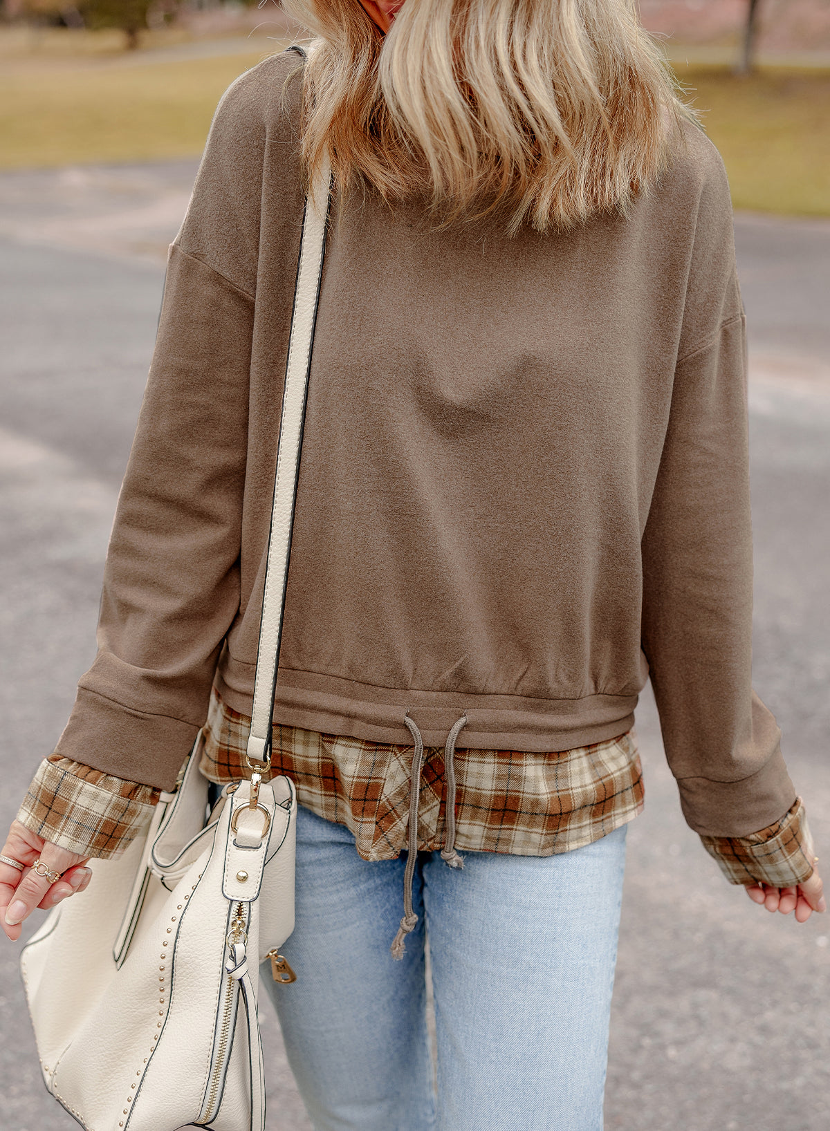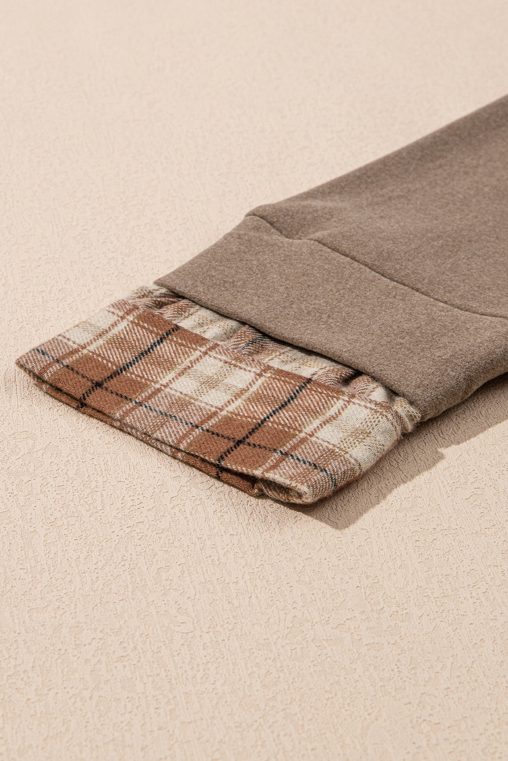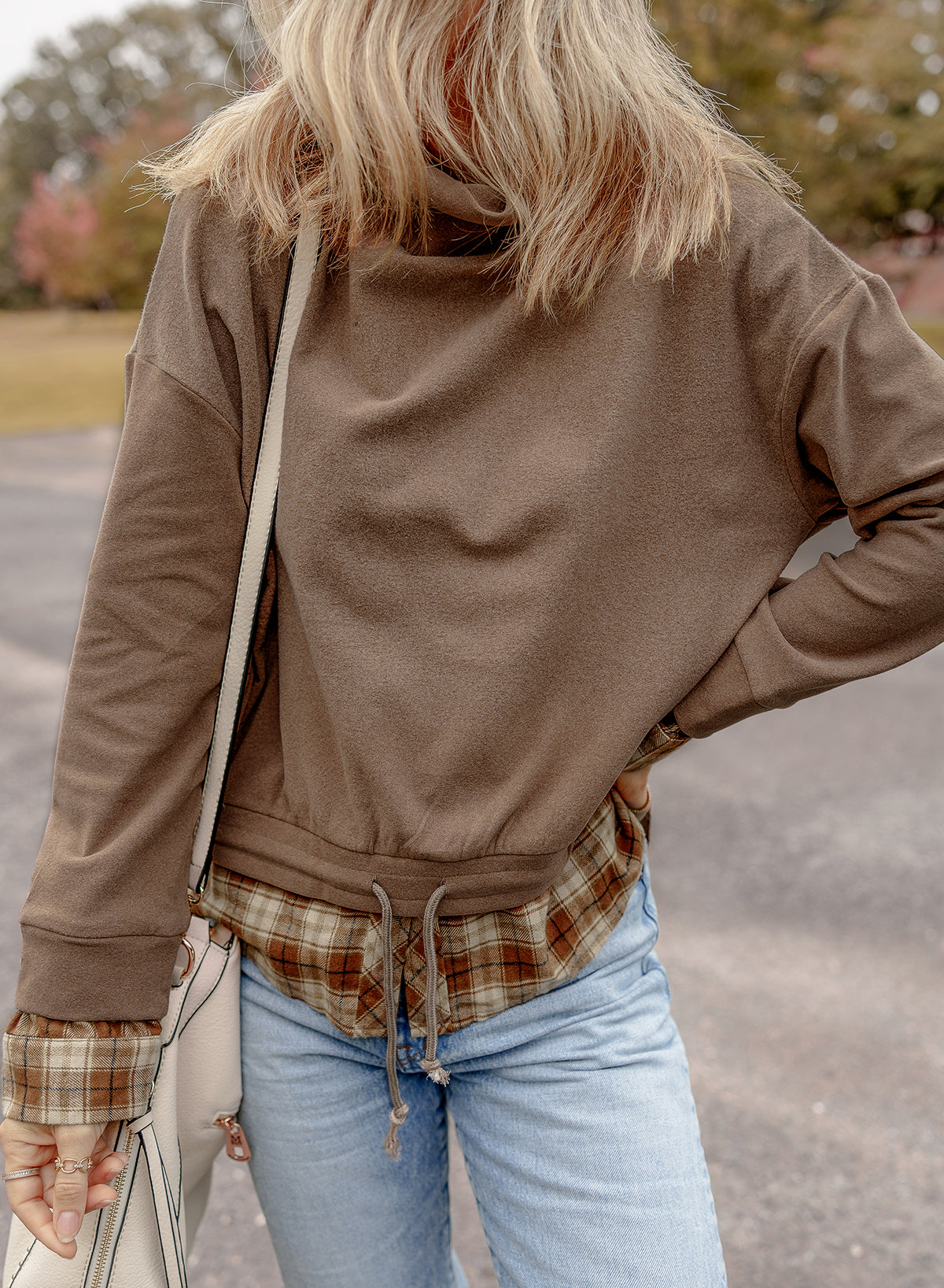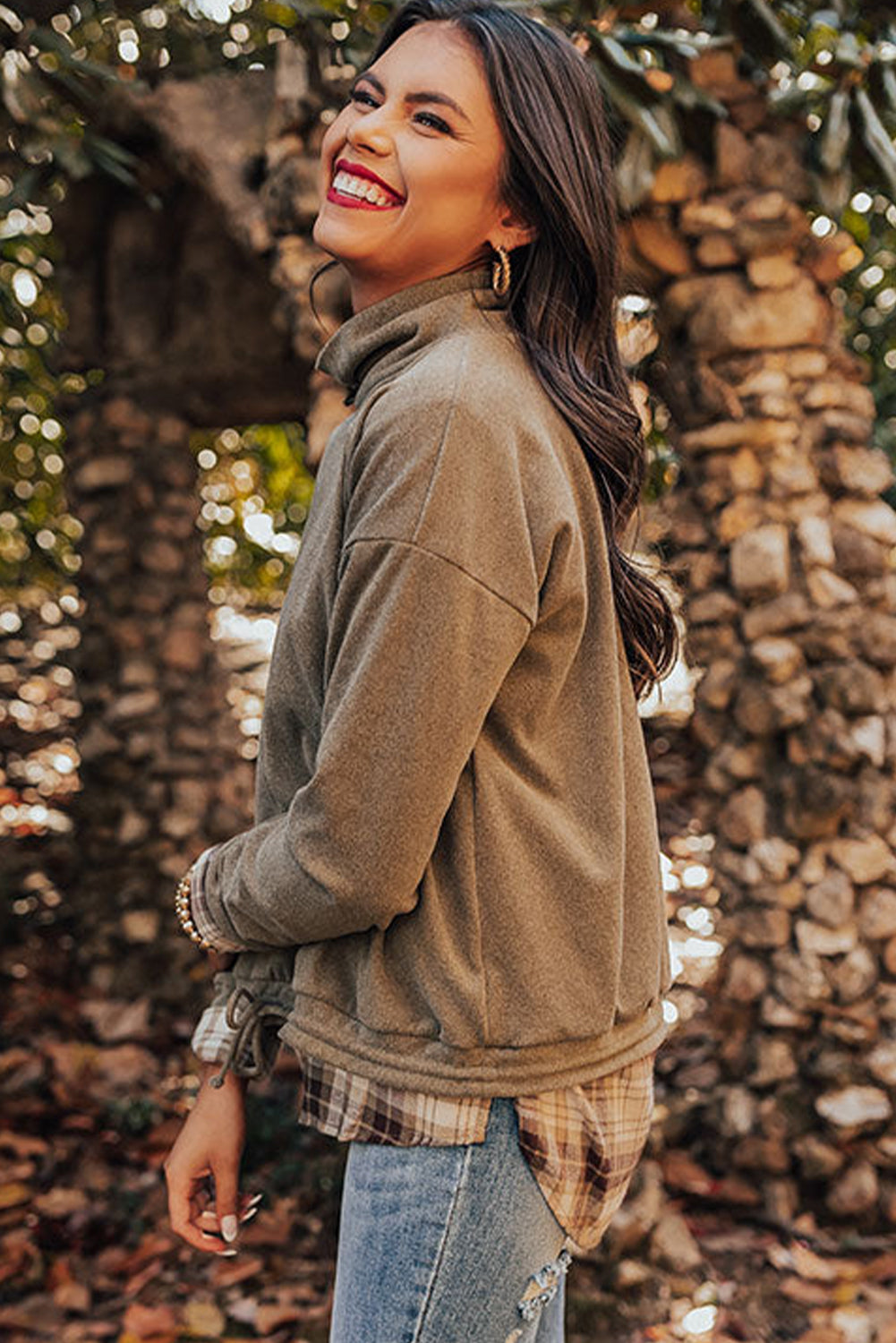 Breen Plaid Patchwork Knotted Hem High Neck Blouse