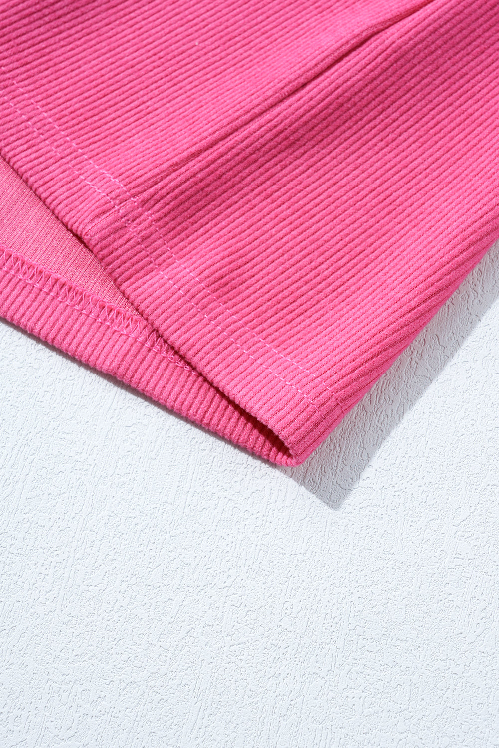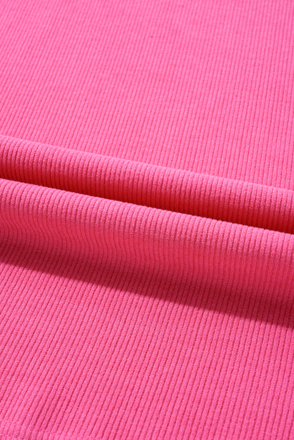 Bright Pink Floral Patchwork Flounce Sleeve Rib Knit Plus Top