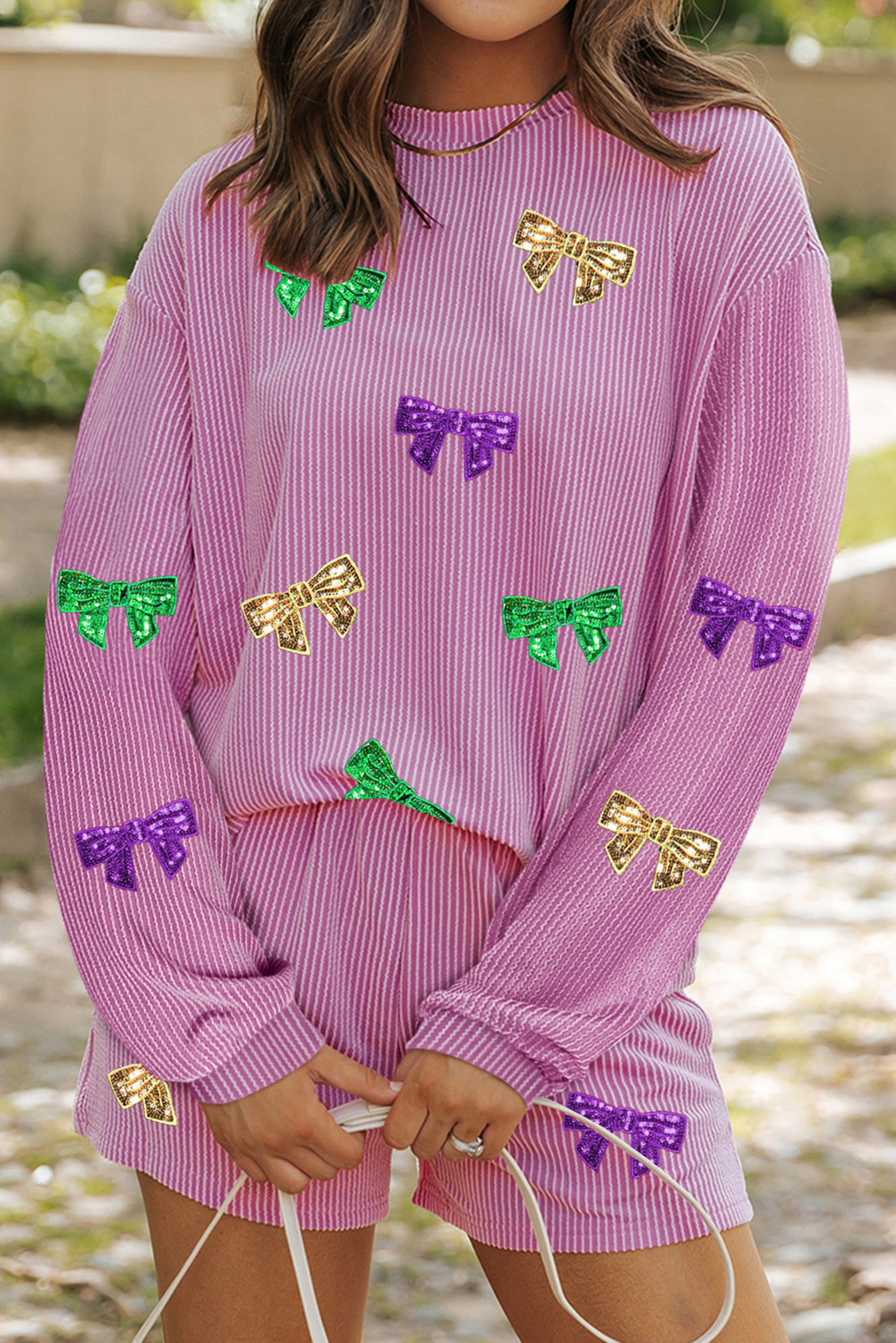 Carbon Grey Bowknot Patched Pattern Corded Long Sleeve Top and Shorts Outfit