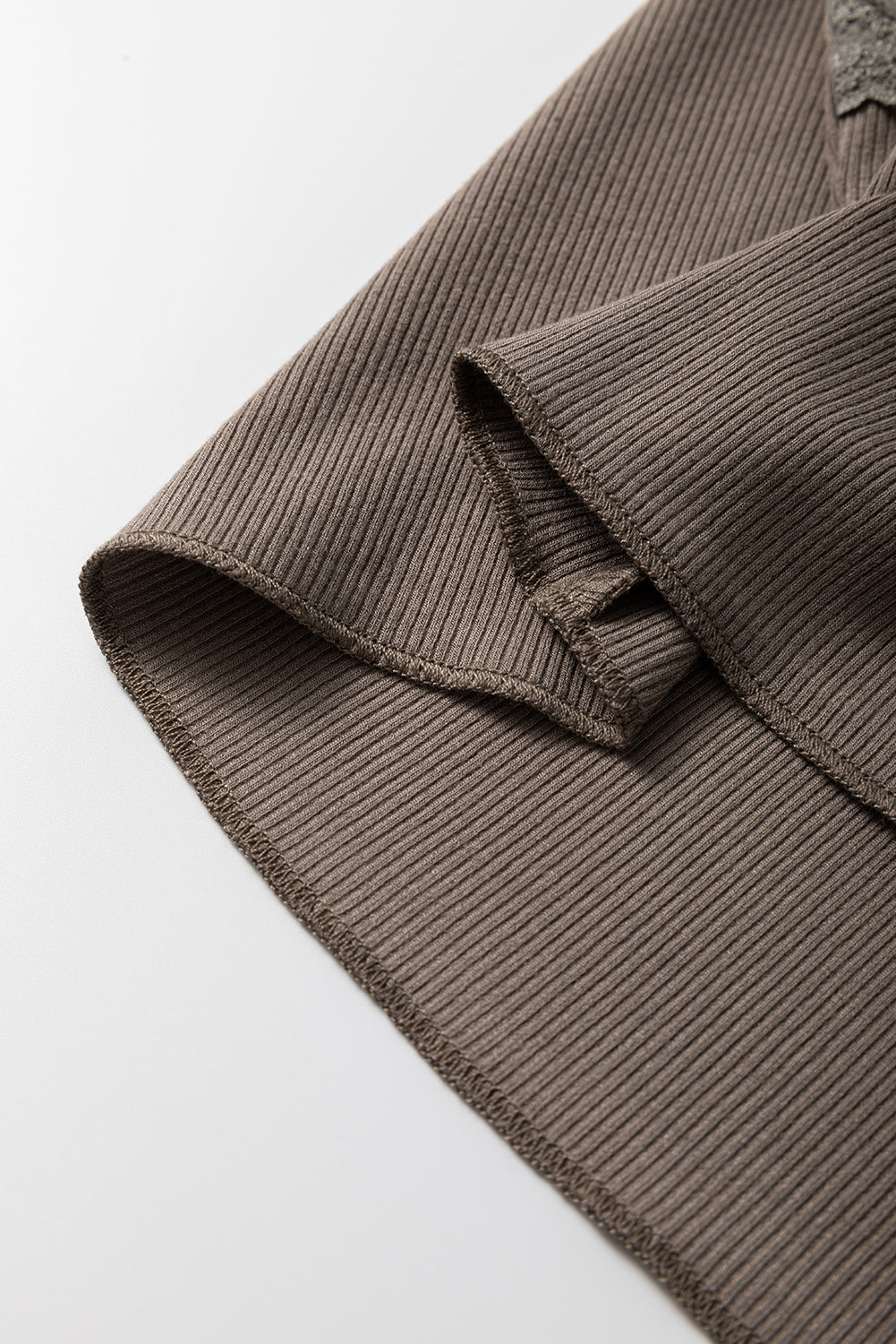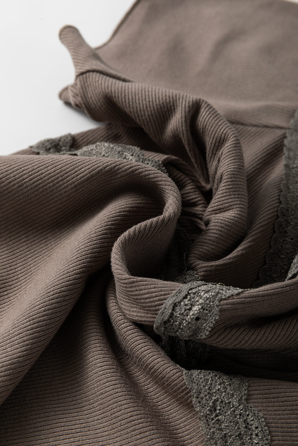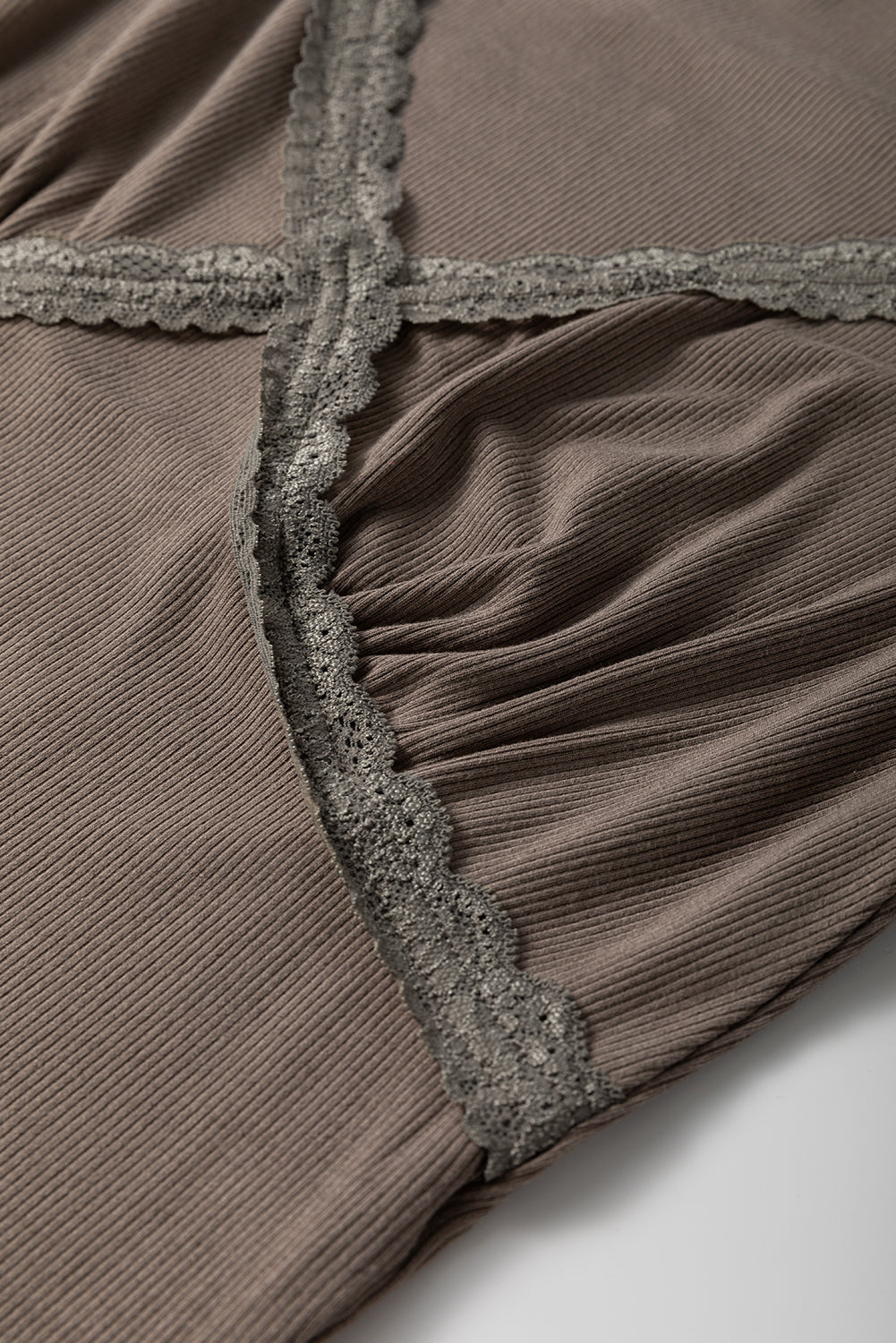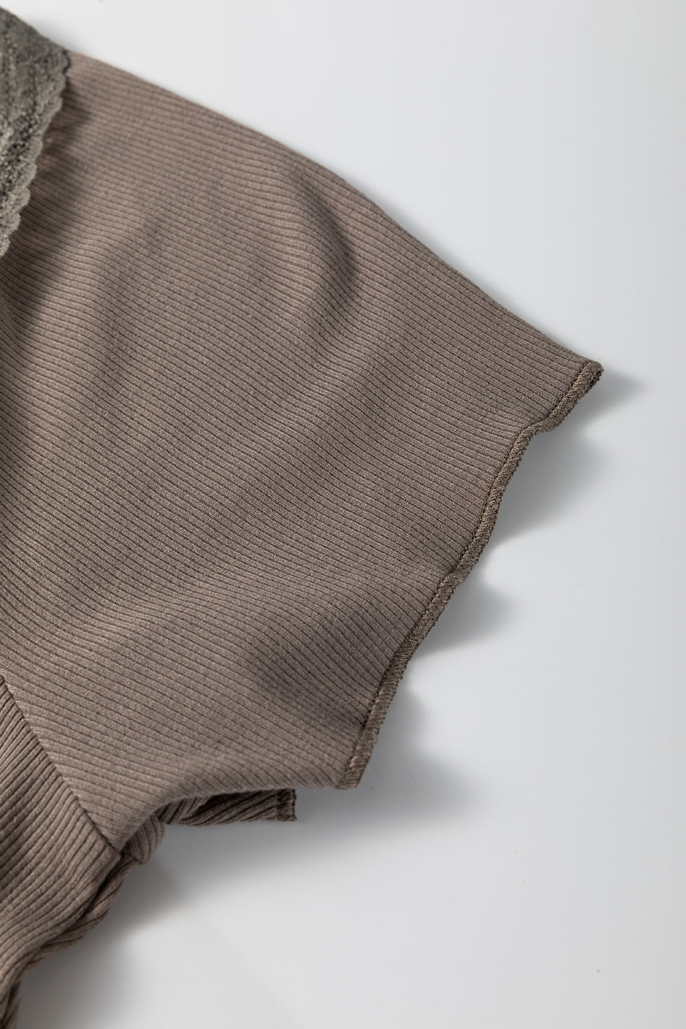 Dark Brown Lace Splicing Criss Cross Slim Fit V Neck T Shirt