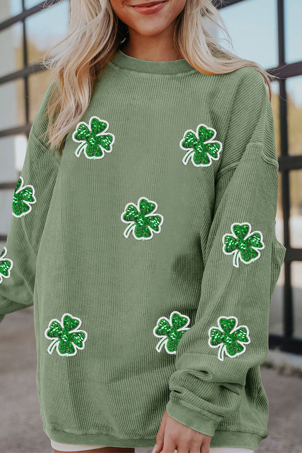 Grass Green Ribbed Four Leaf Clover Graphic St. Patricks Pullover Sweatshirt
