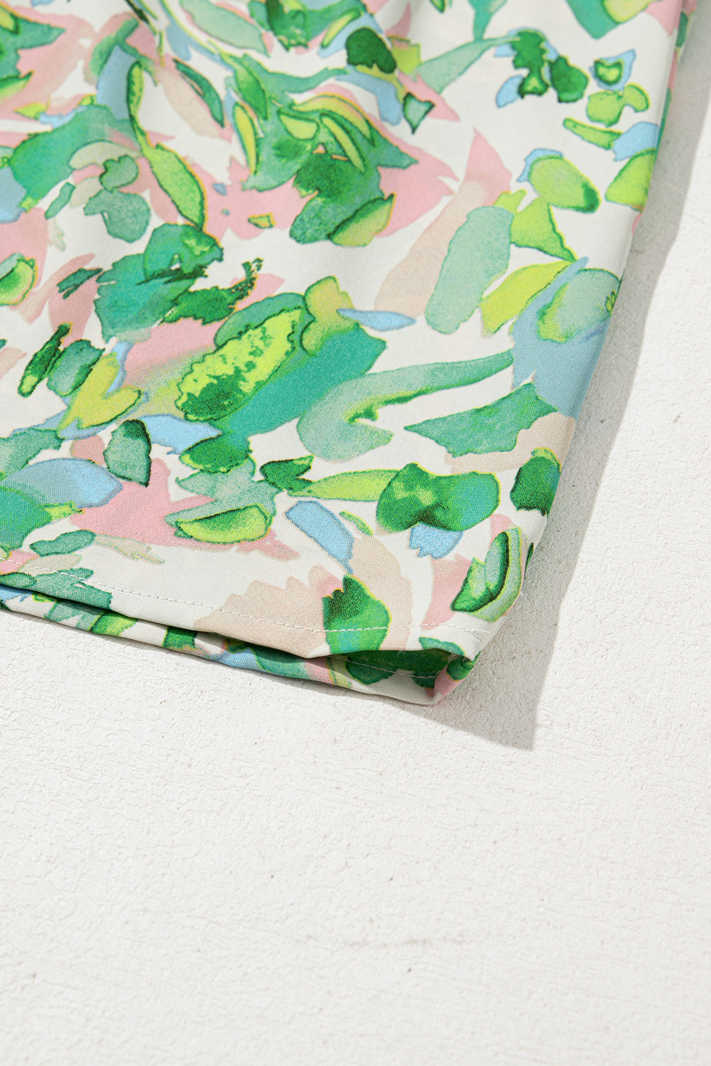 Green Leafy Printed Flounce Sleeve Shirred Mock Neck Blouse