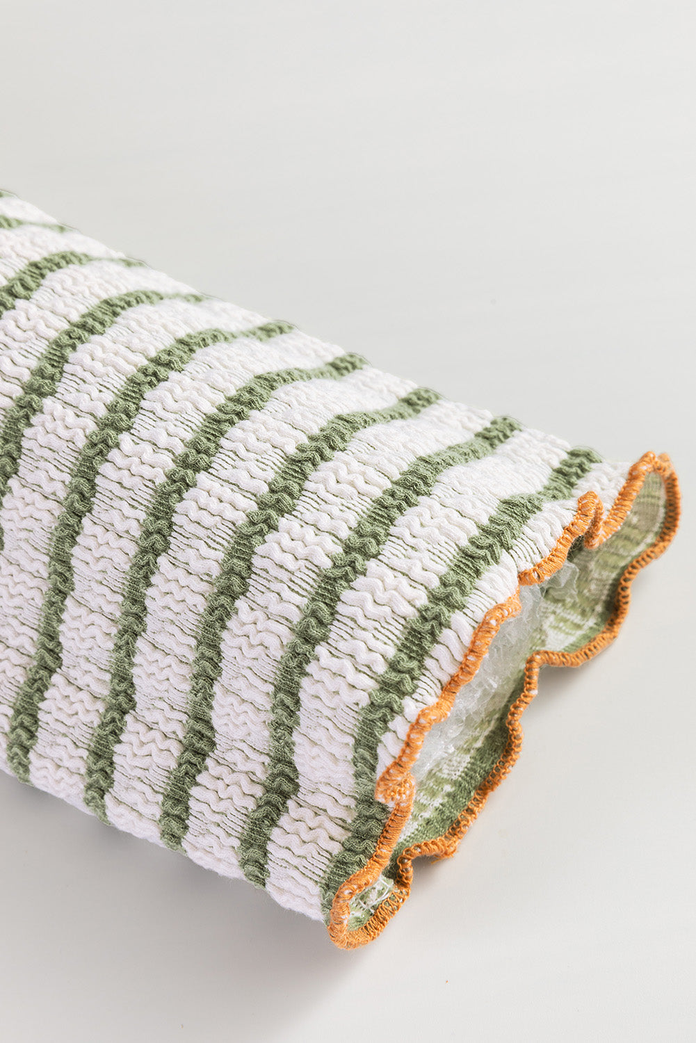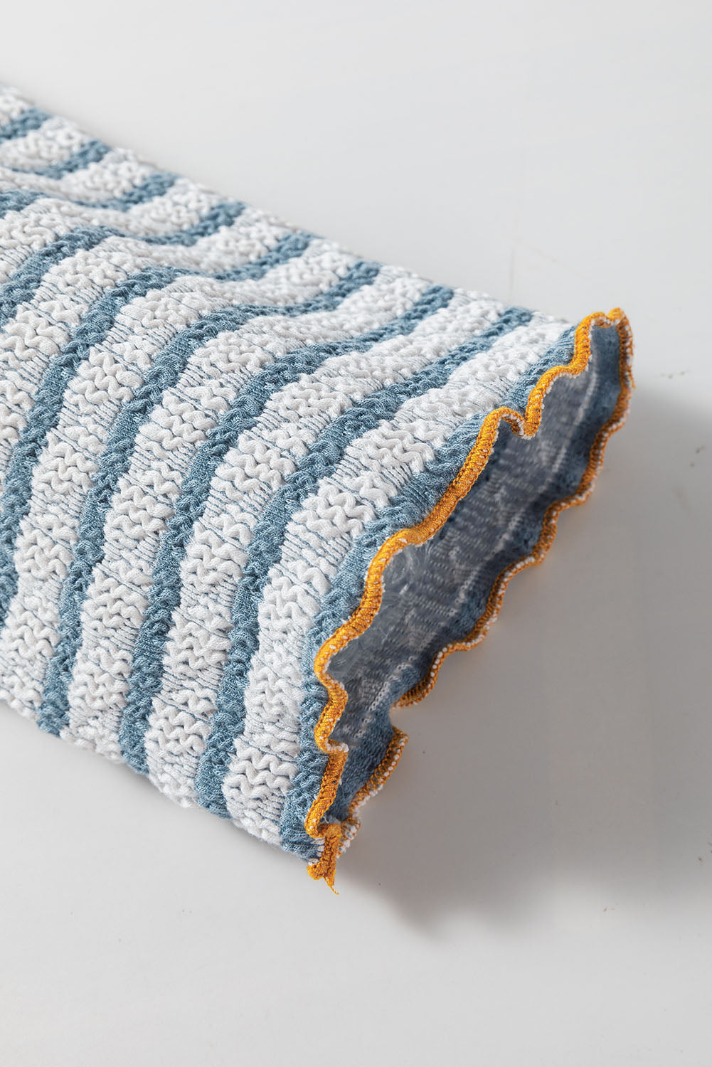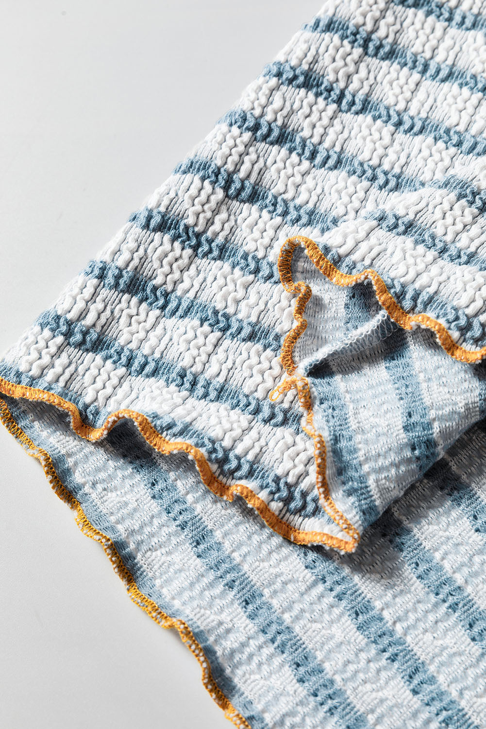 Green Stripe Textured Frilly Trim Buttons Henley Long Sleeve Top