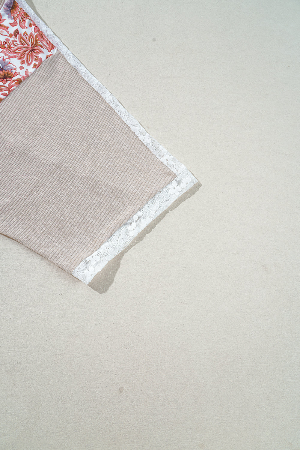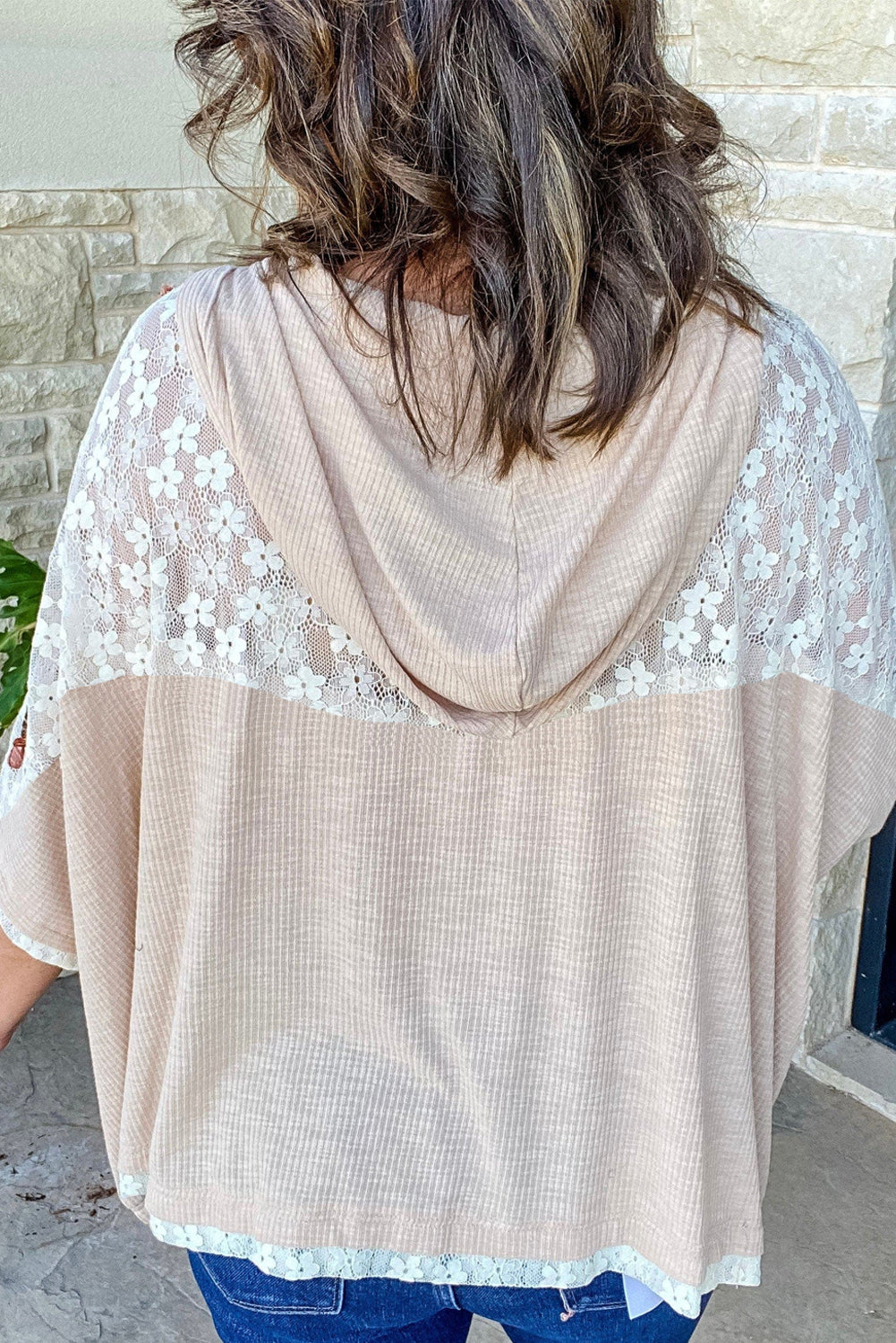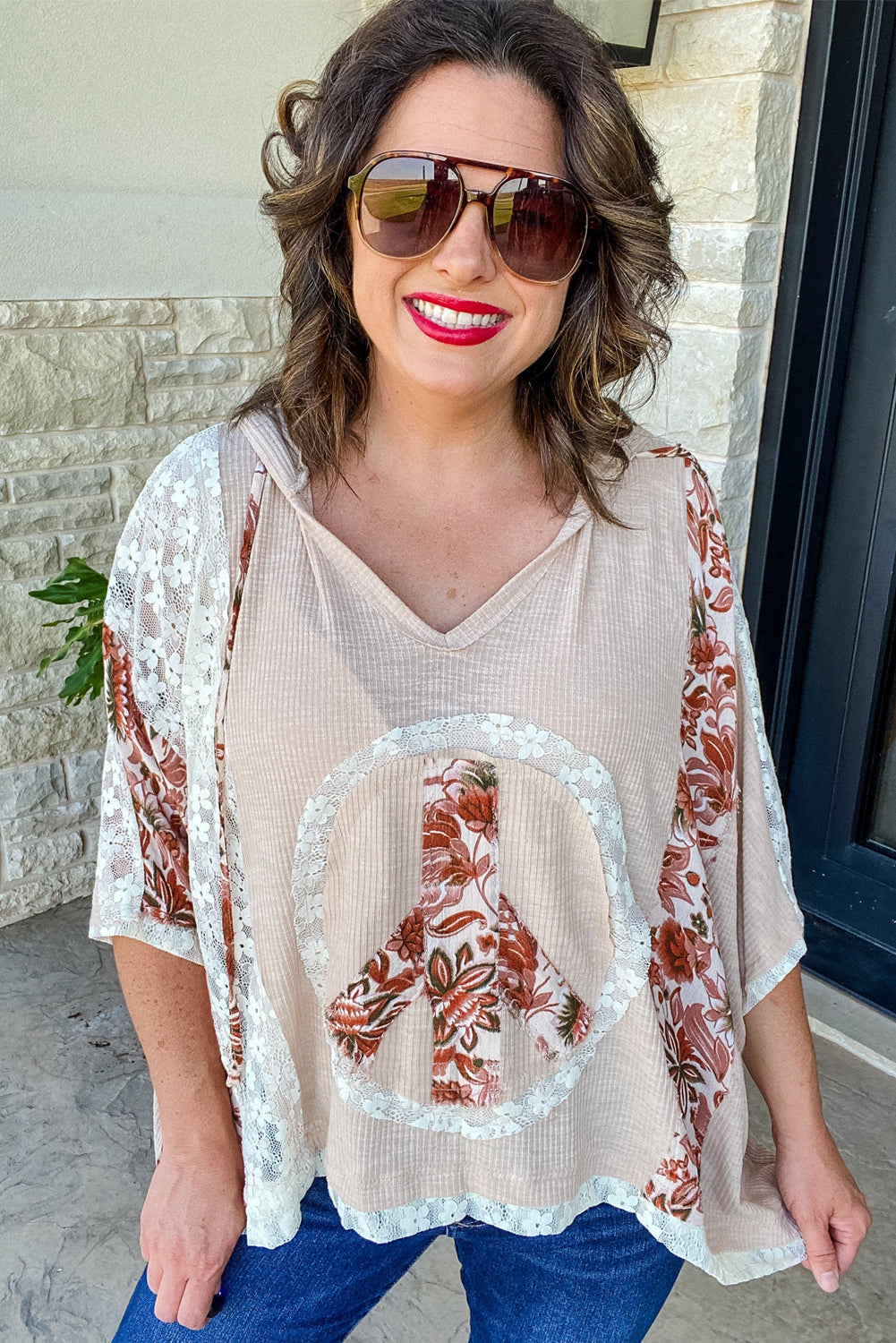 Khaki V Neck Floral Peace Sign Graphic Lace Patch Ribbed Plus Size Hooded Top