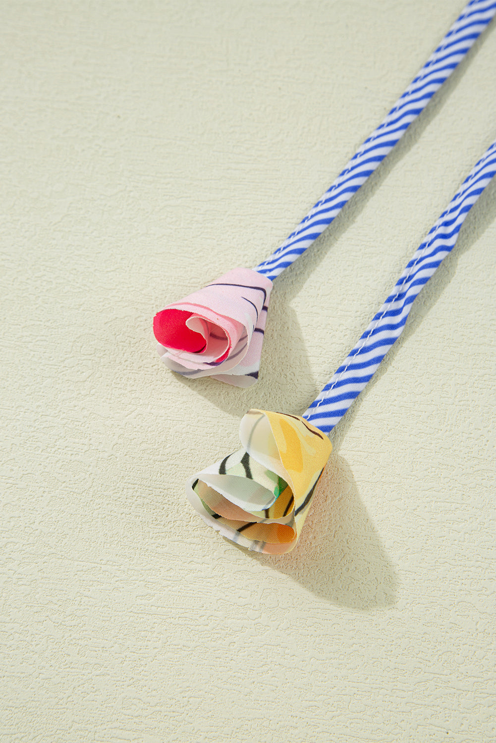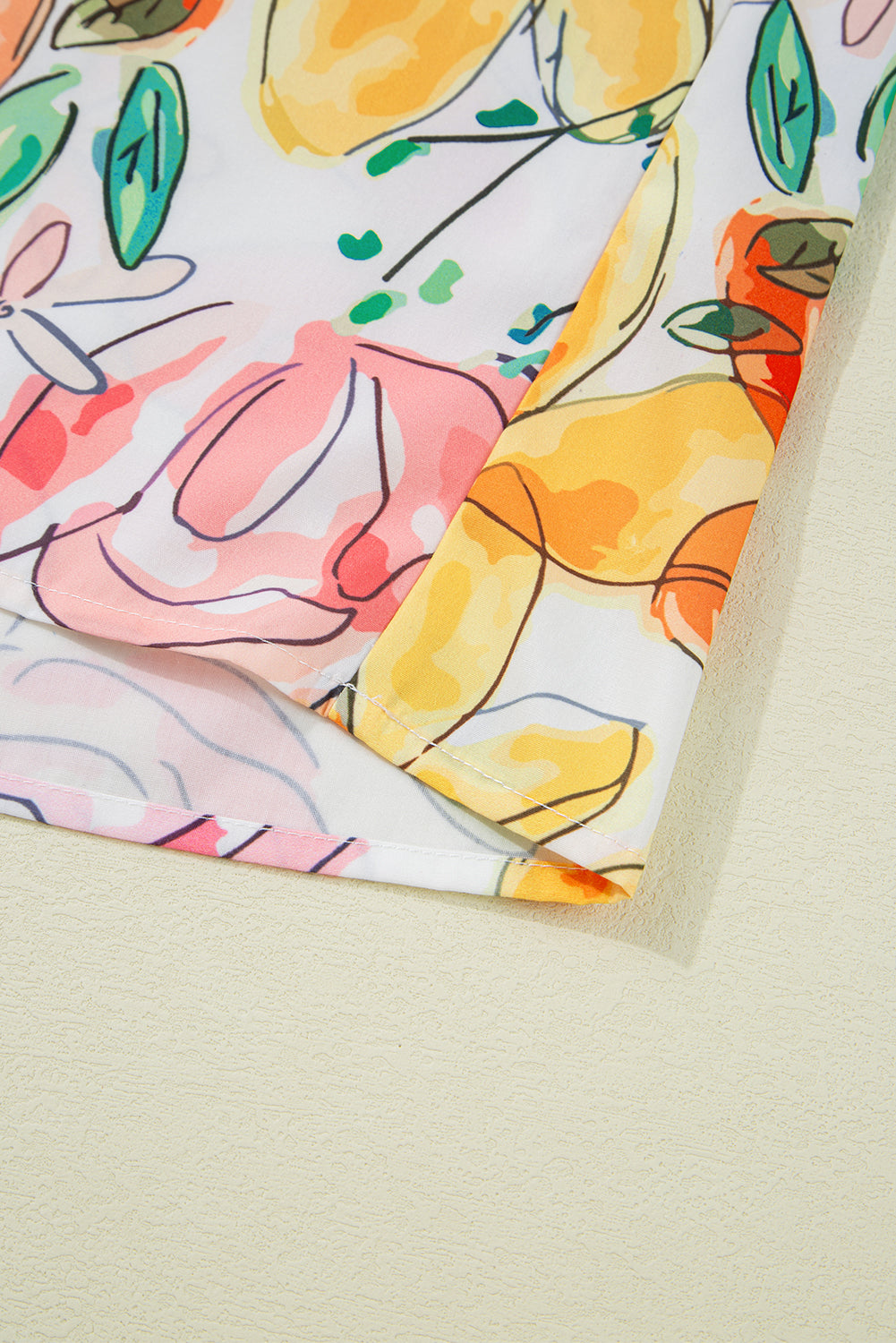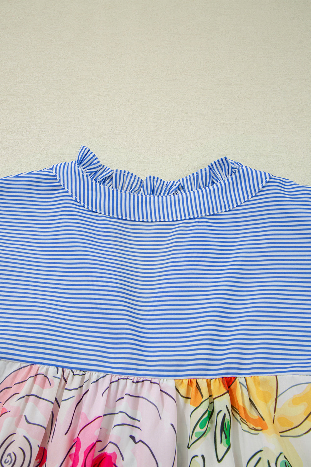 Multicolour Floral Print Striped Yoke Frilled V Neck Puff Short Sleeve Blouse