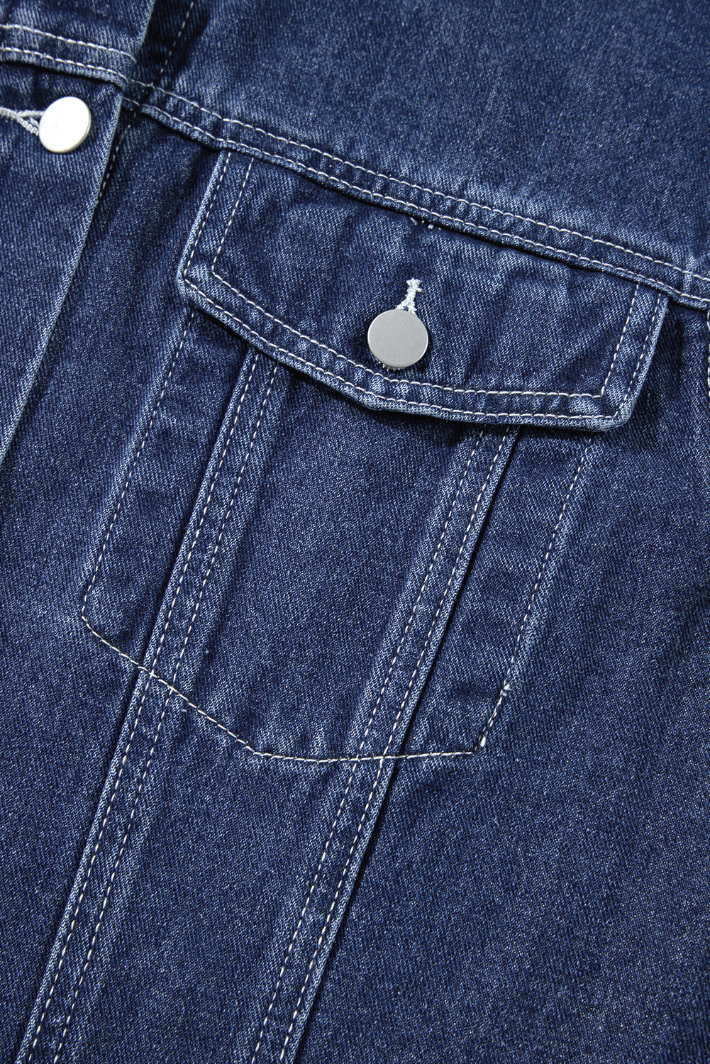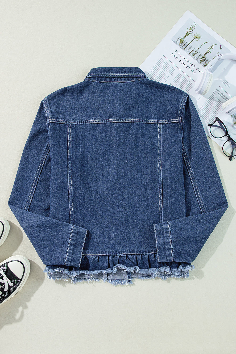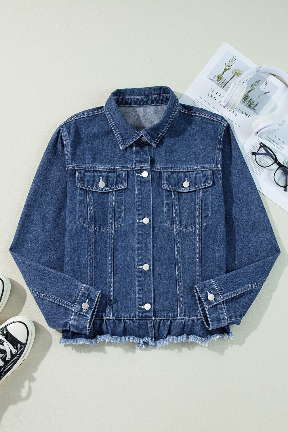 Navy Blue Ruffle Raw Hem Flap Pockets Denim Jacket