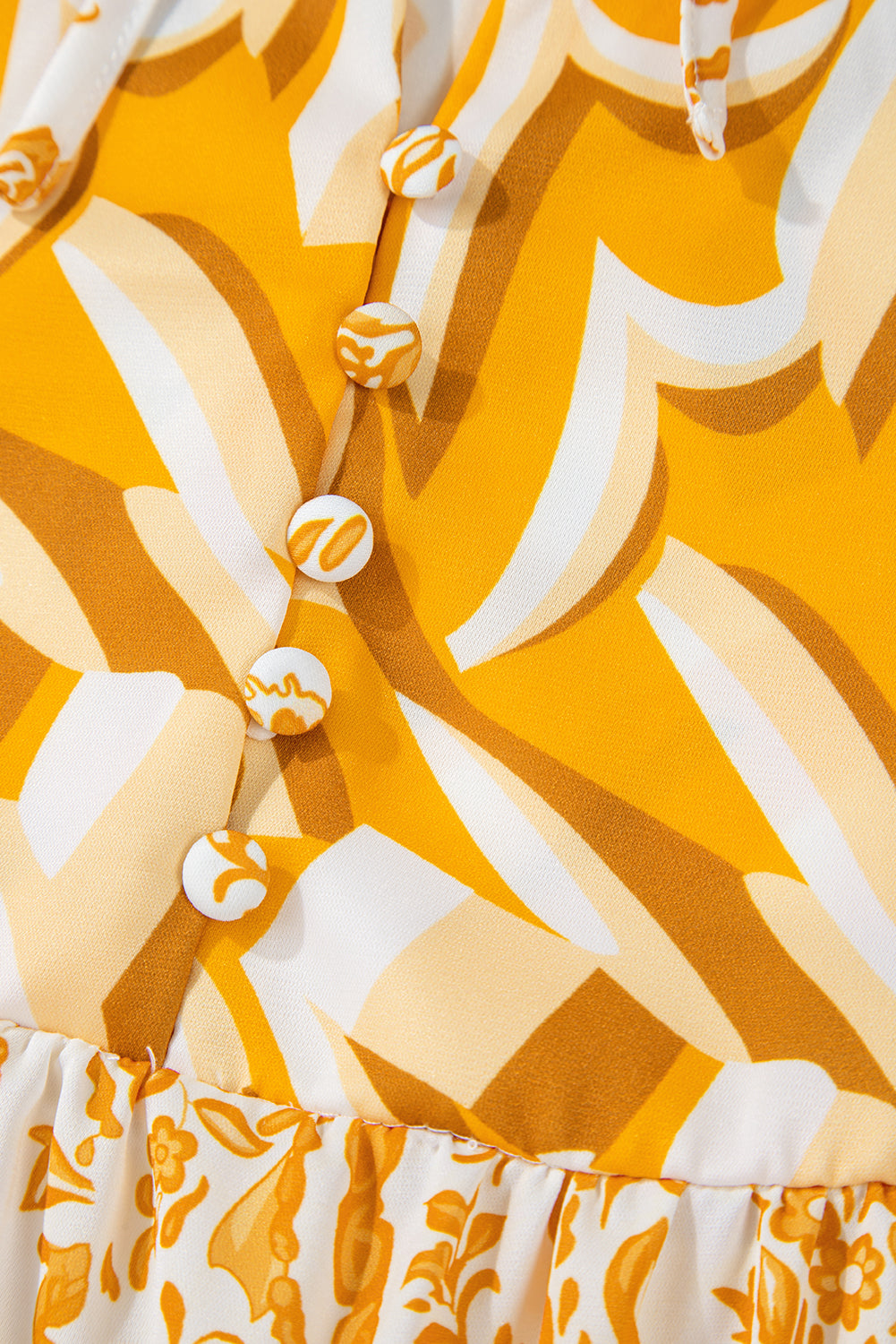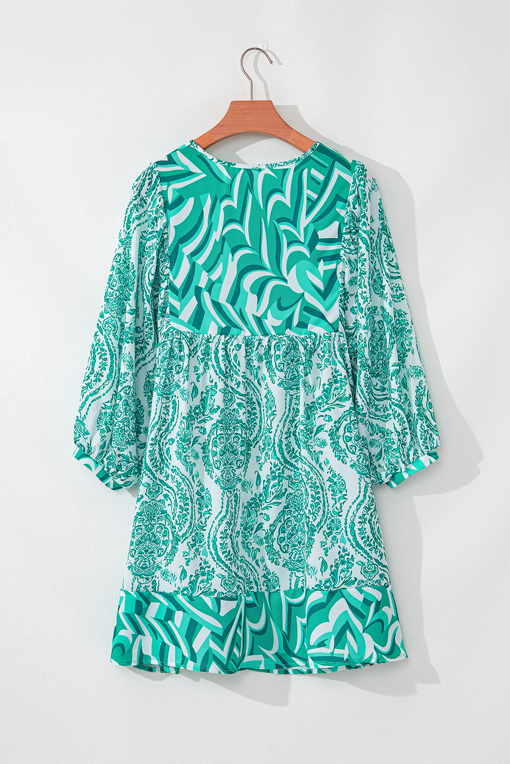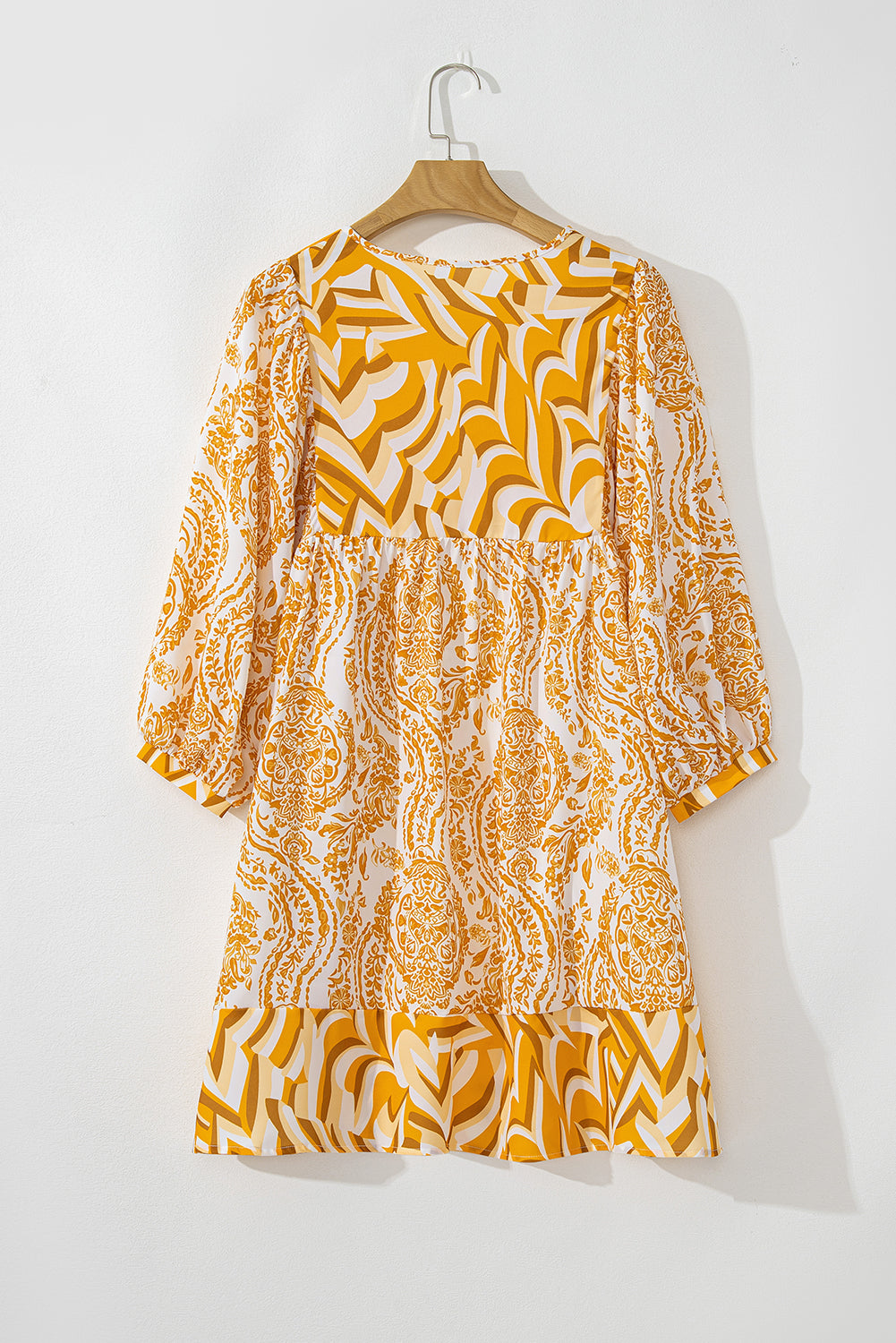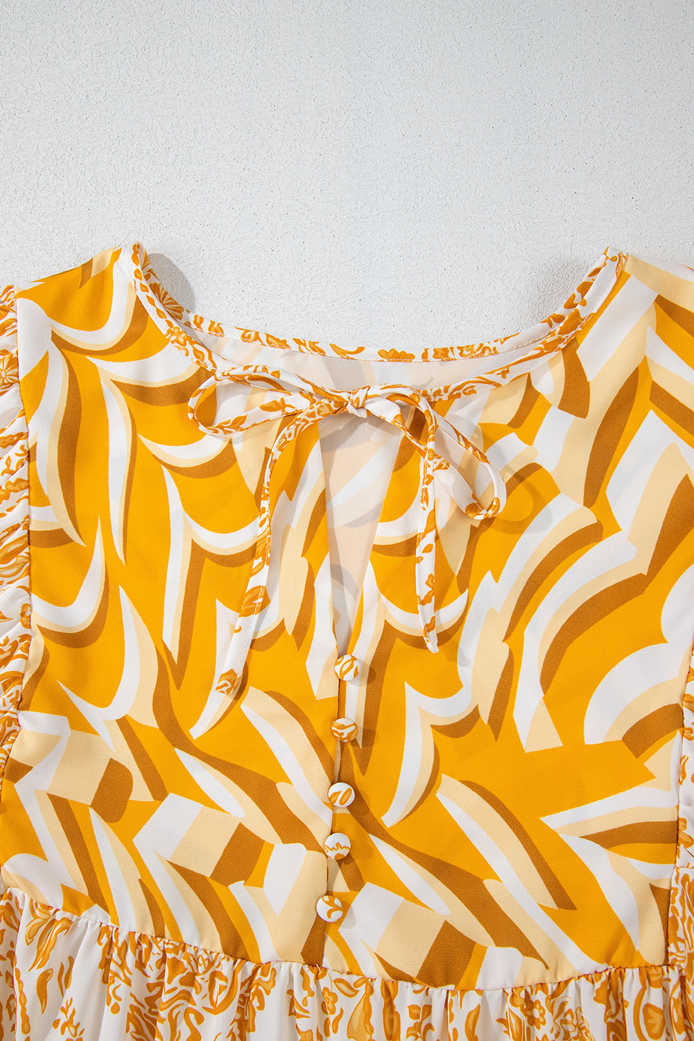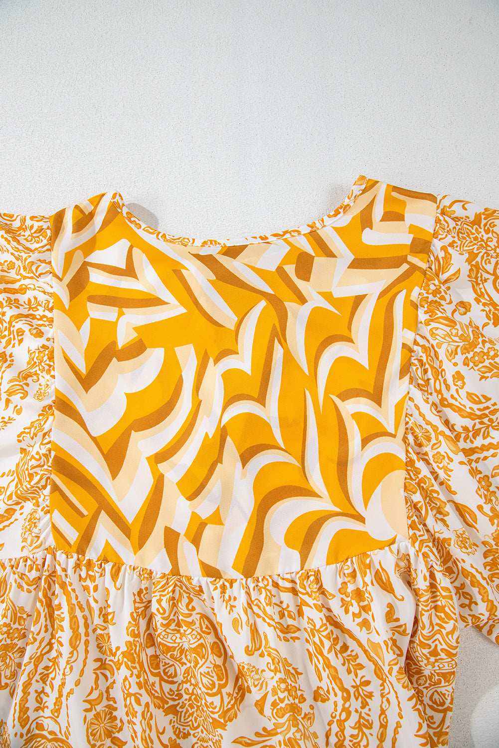 Orange Bohemian Print Puff Sleeve Tied V Neck Flared Mini Dress