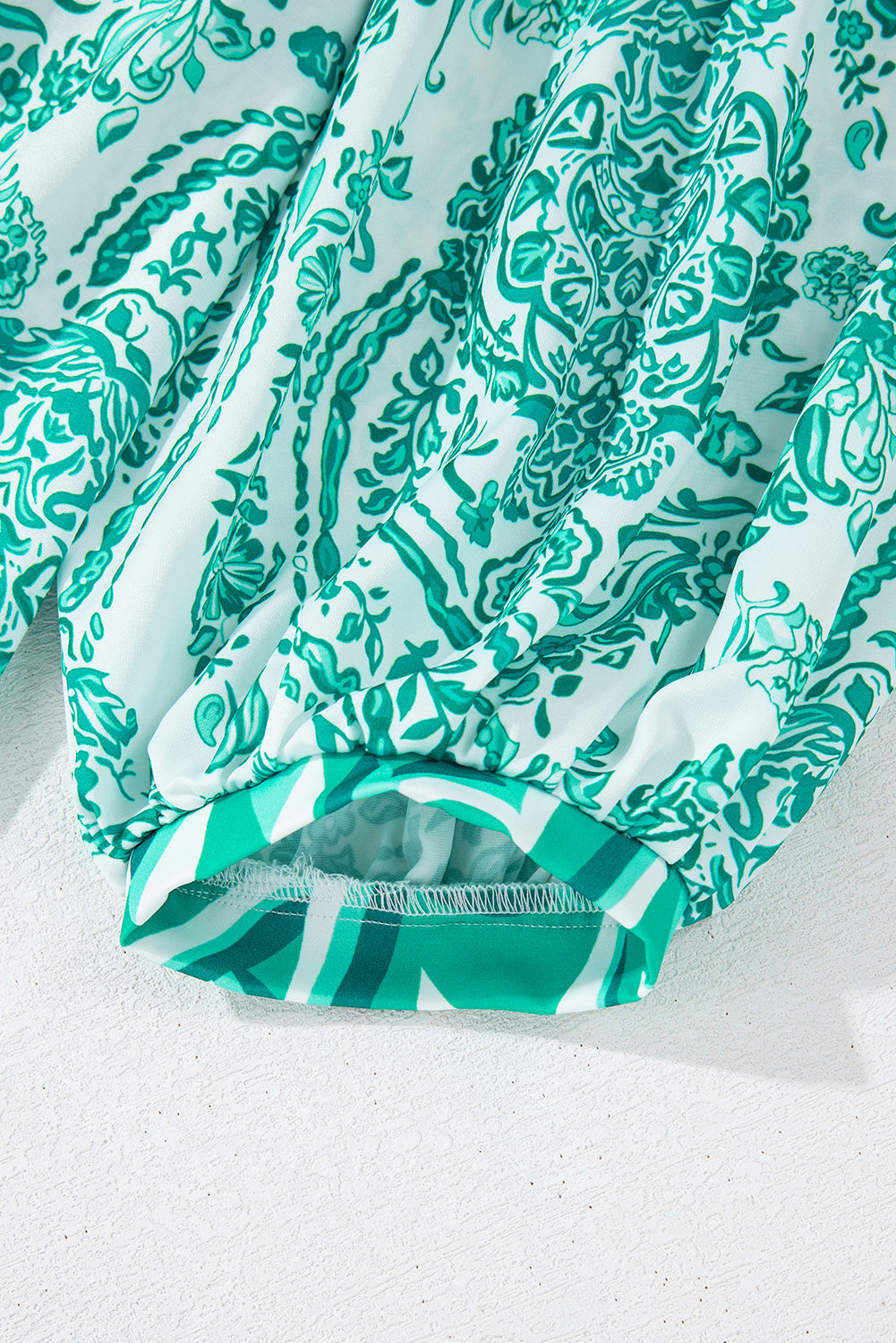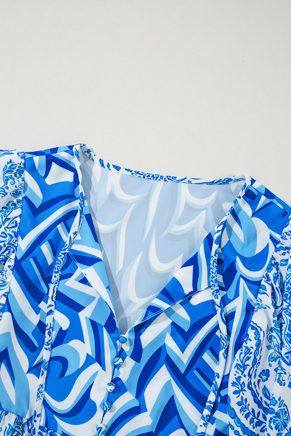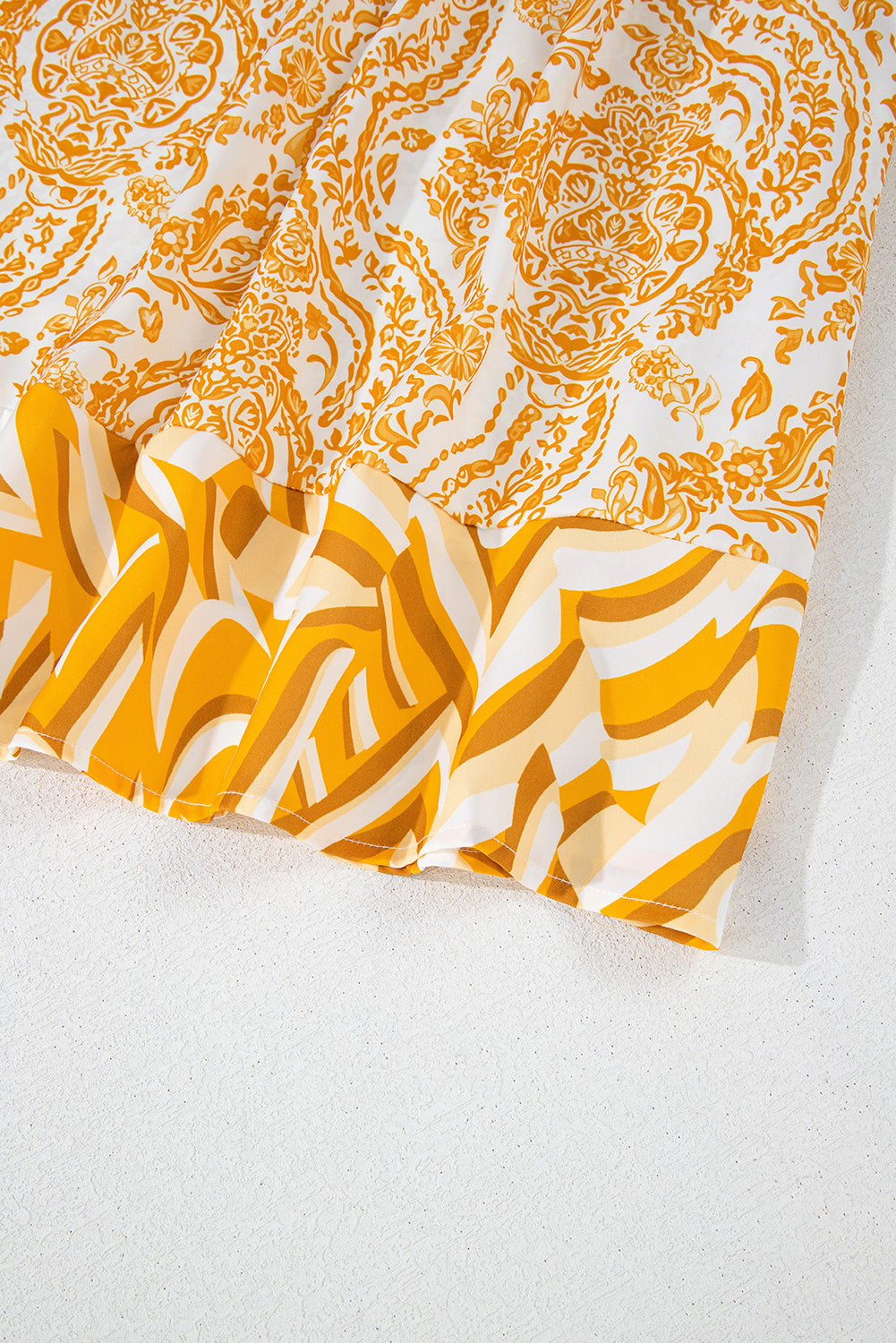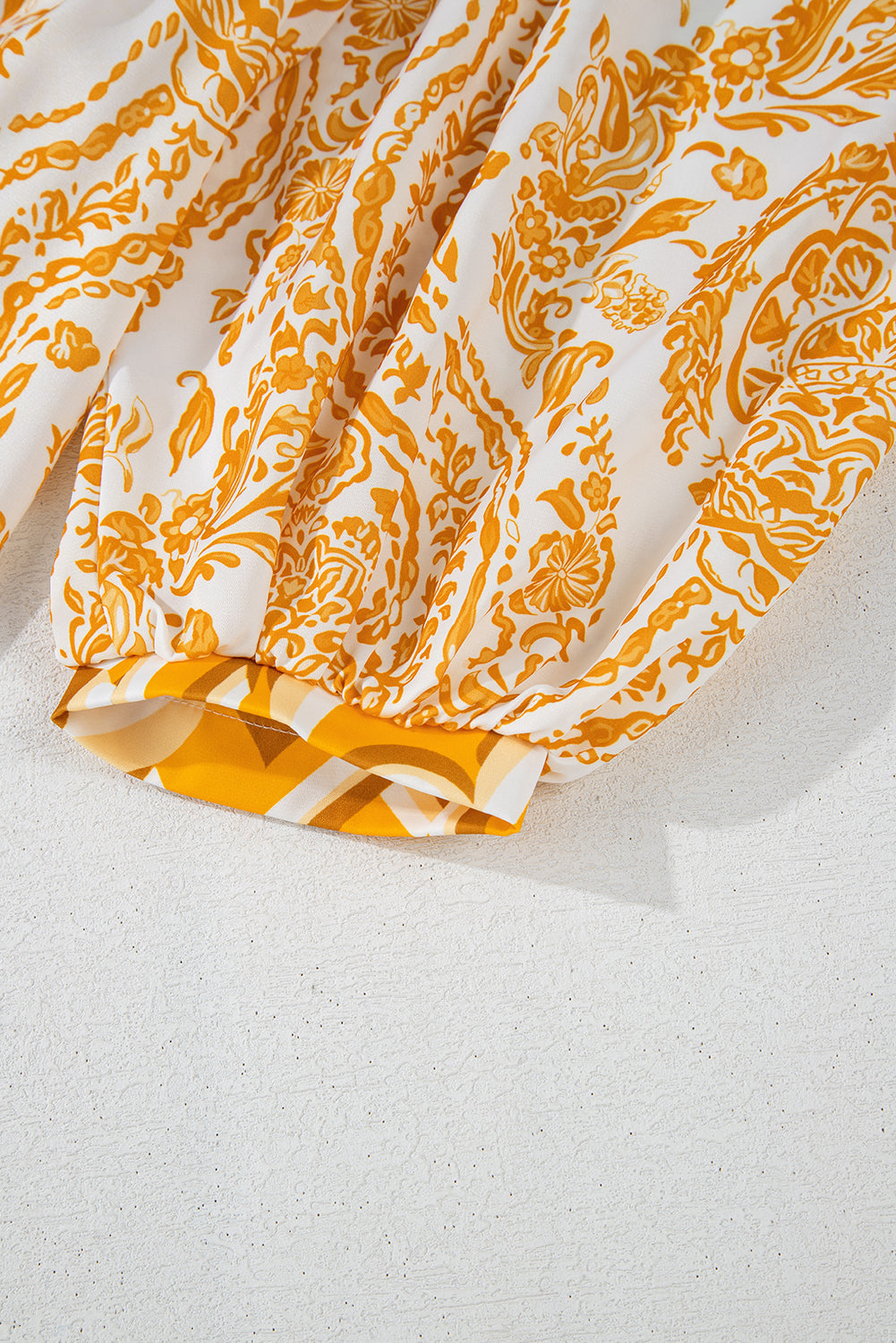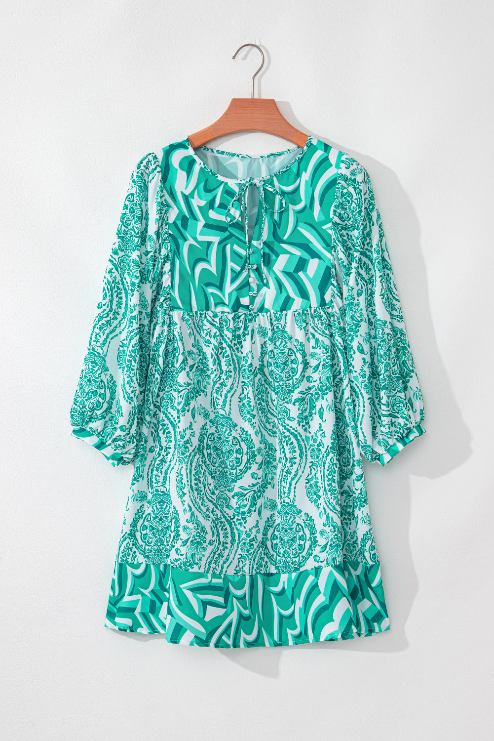 Orange Bohemian Print Puff Sleeve Tied V Neck Flared Mini Dress