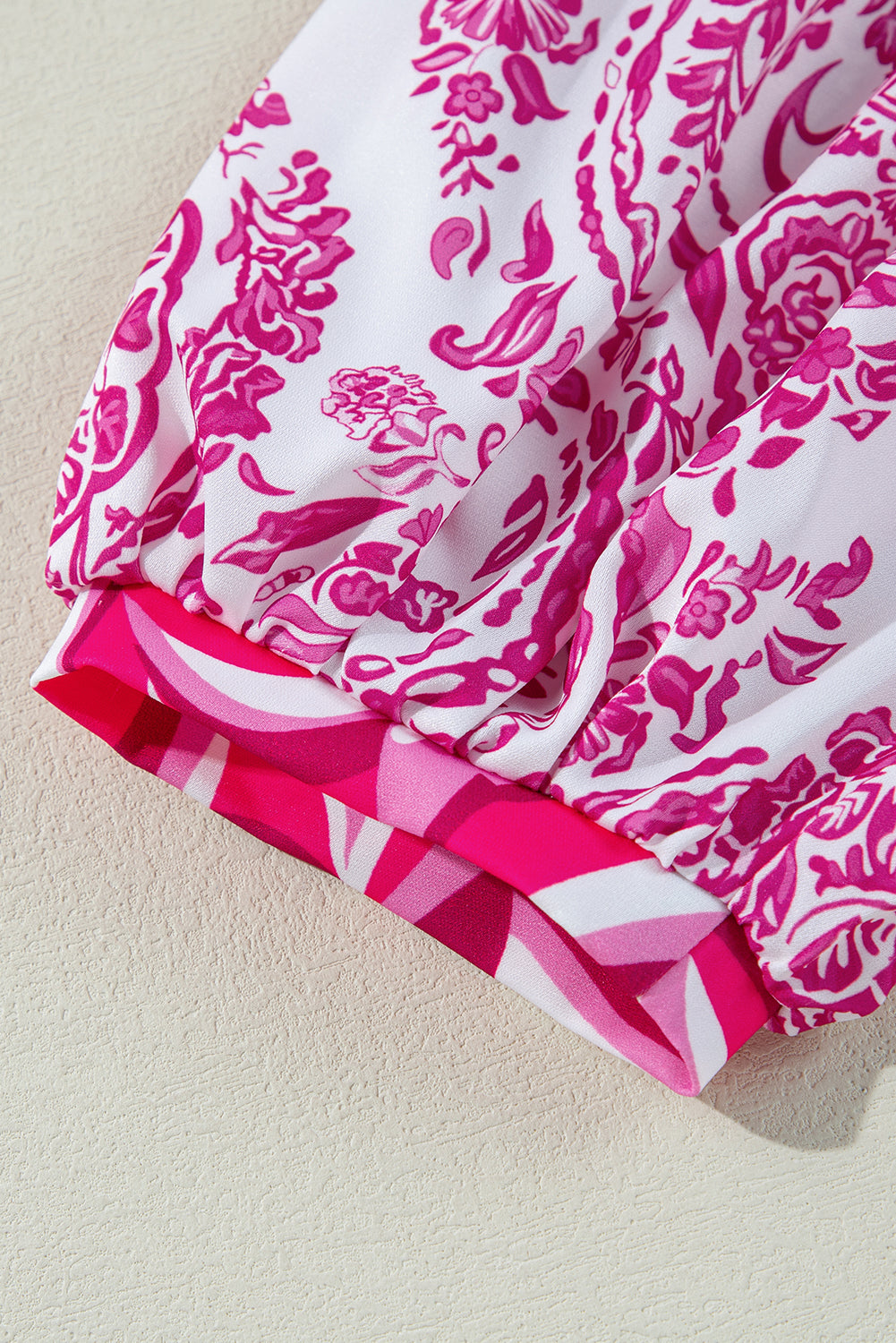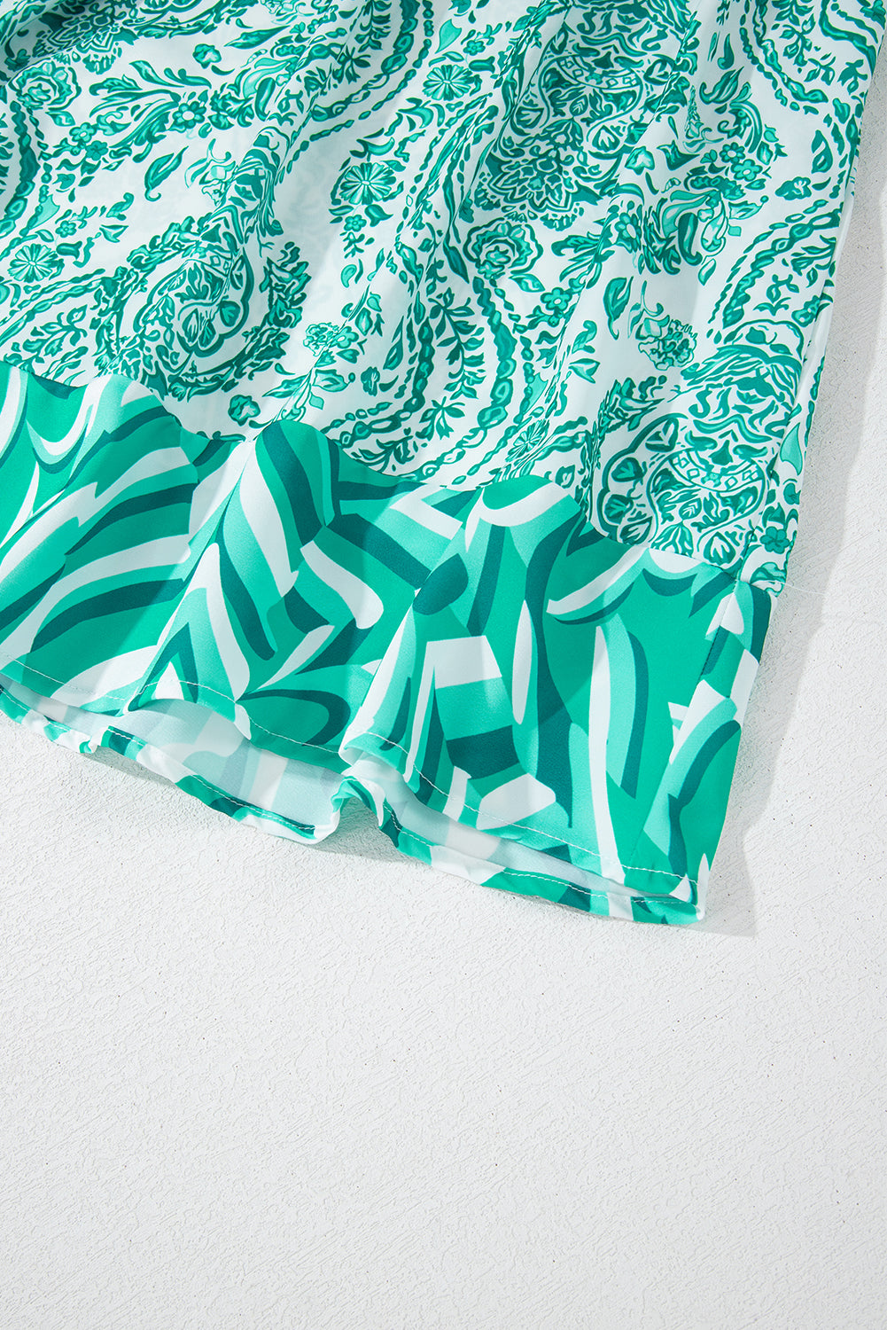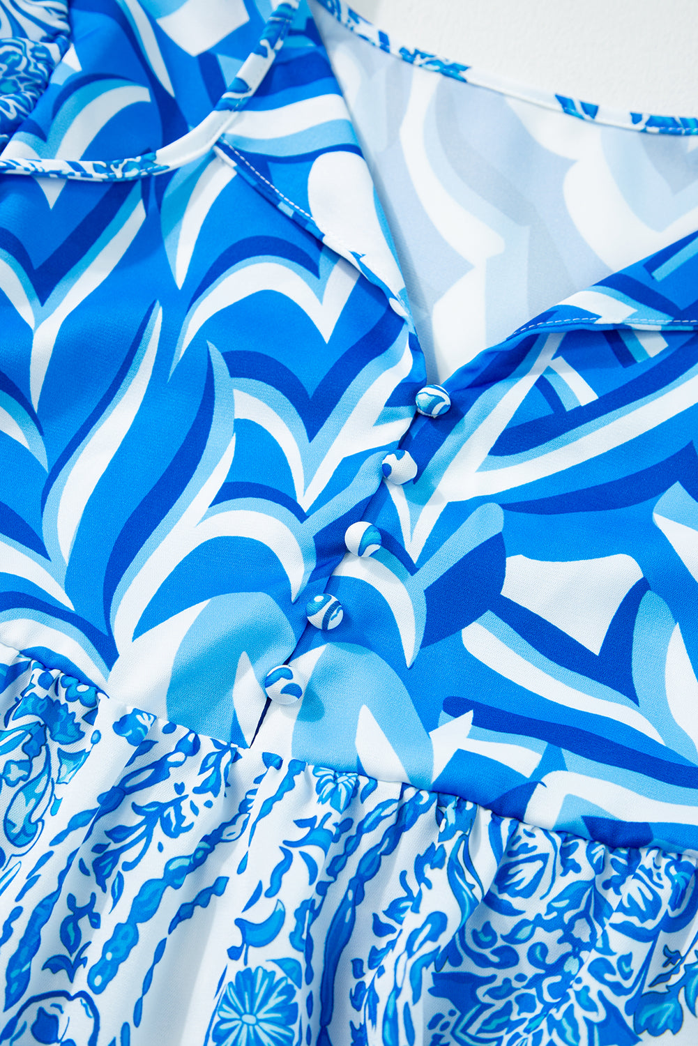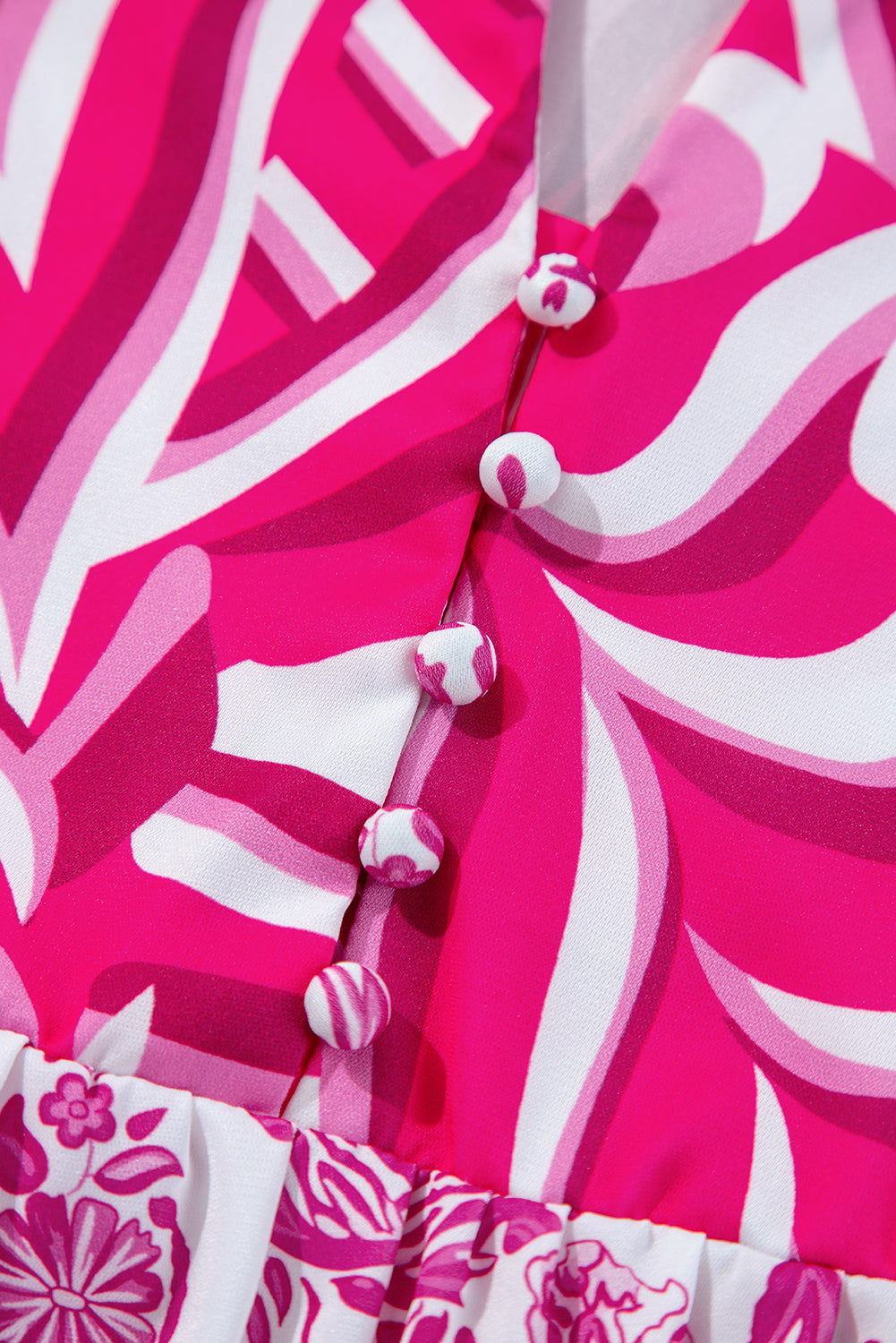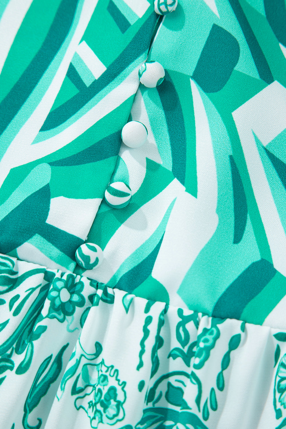 Orange Bohemian Print Puff Sleeve Tied V Neck Flared Mini Dress