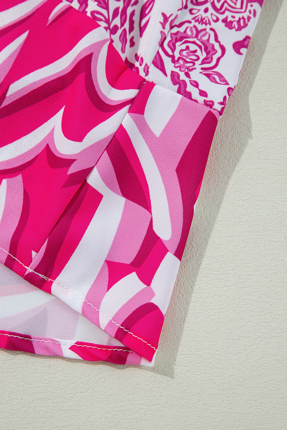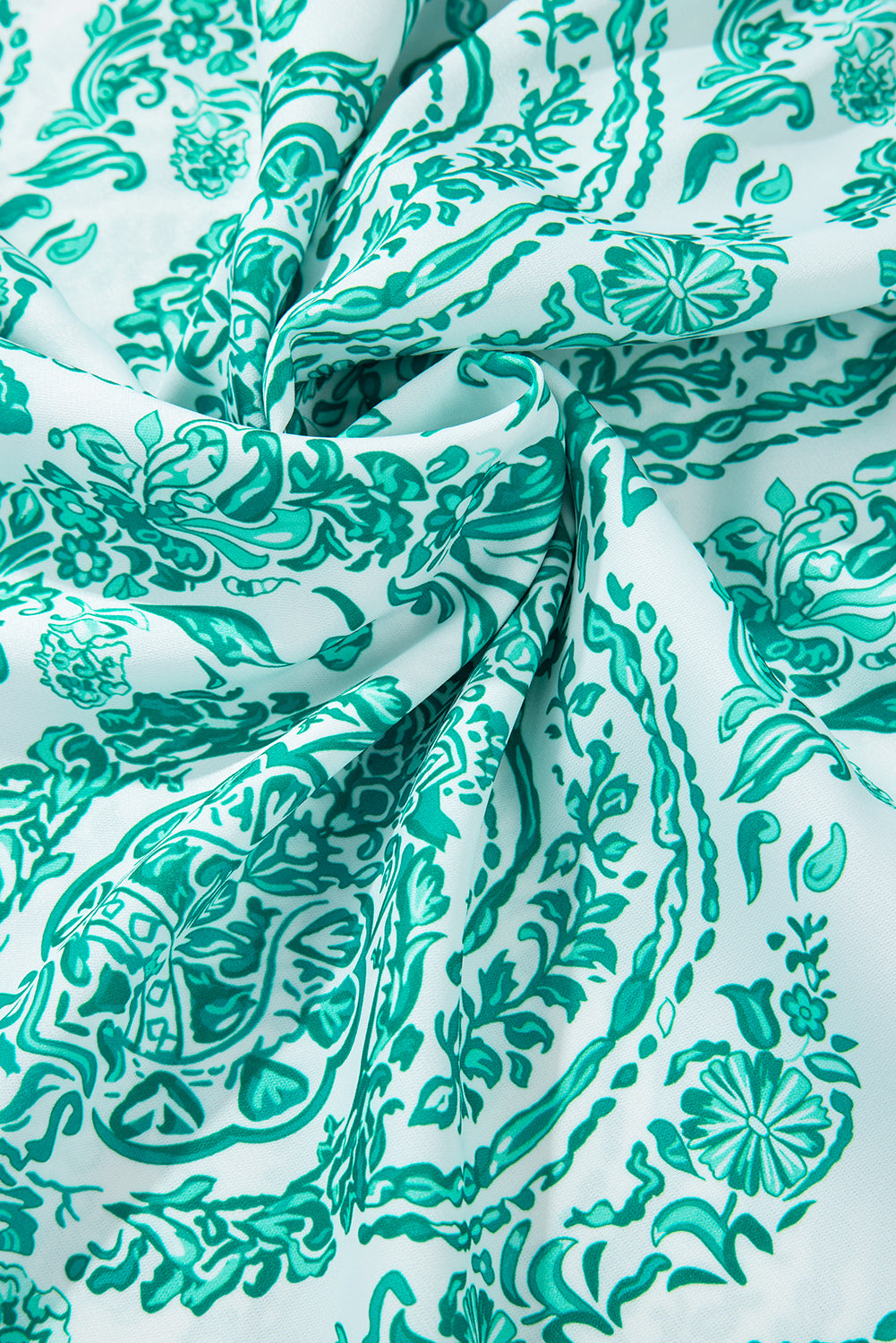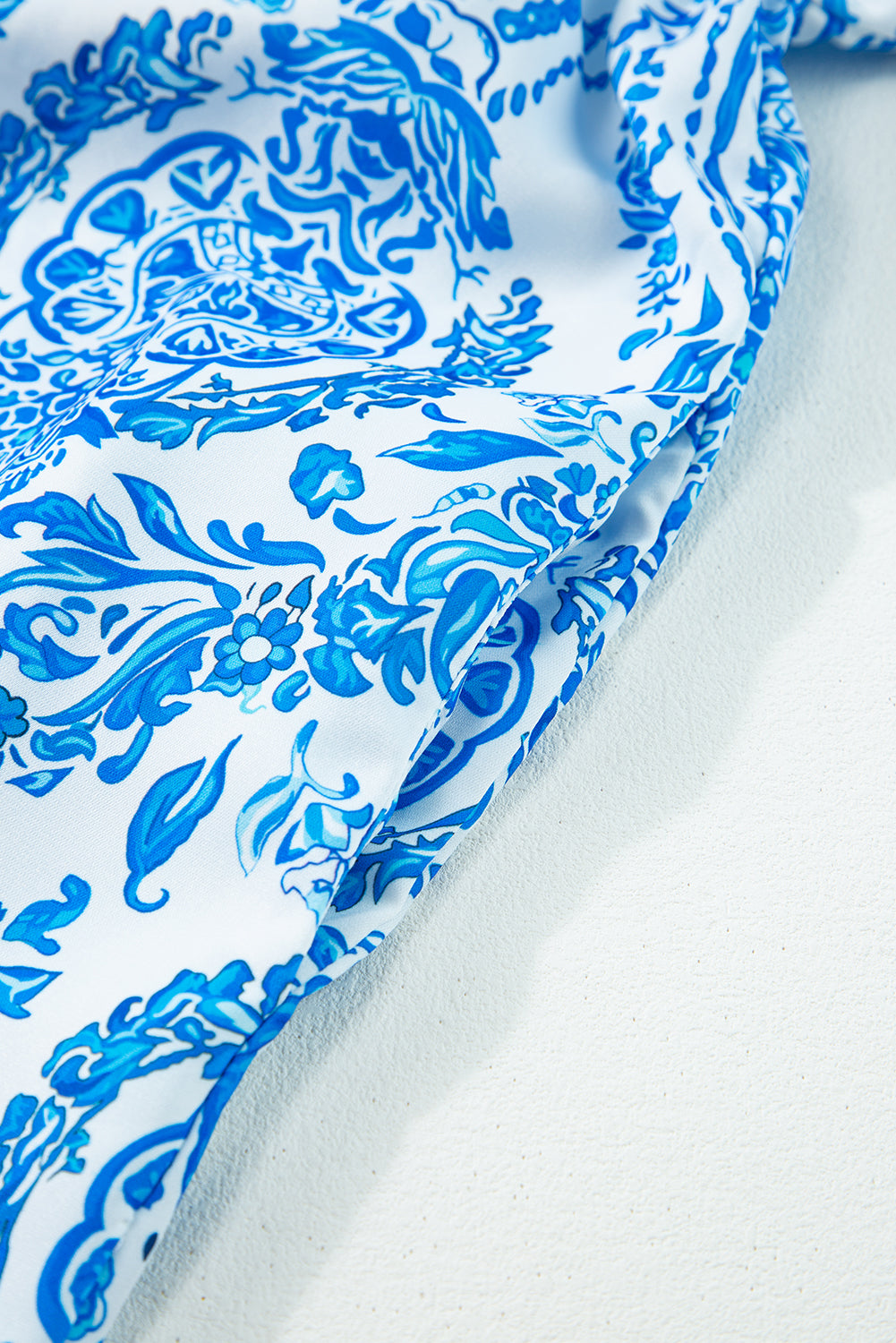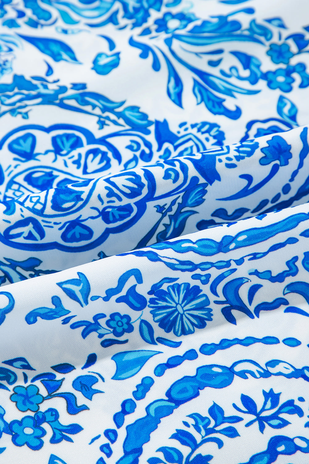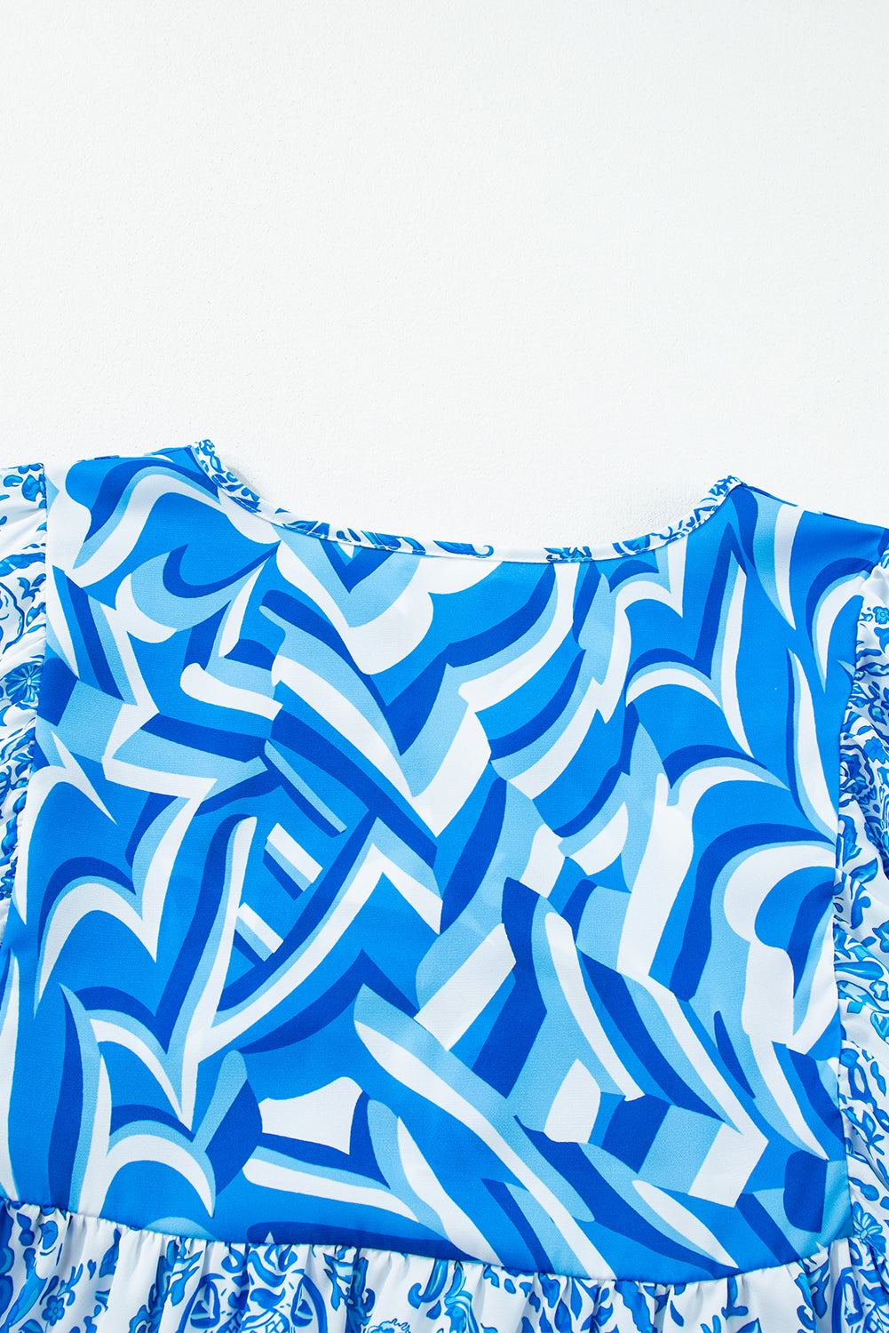 Orange Bohemian Print Puff Sleeve Tied V Neck Flared Mini Dress