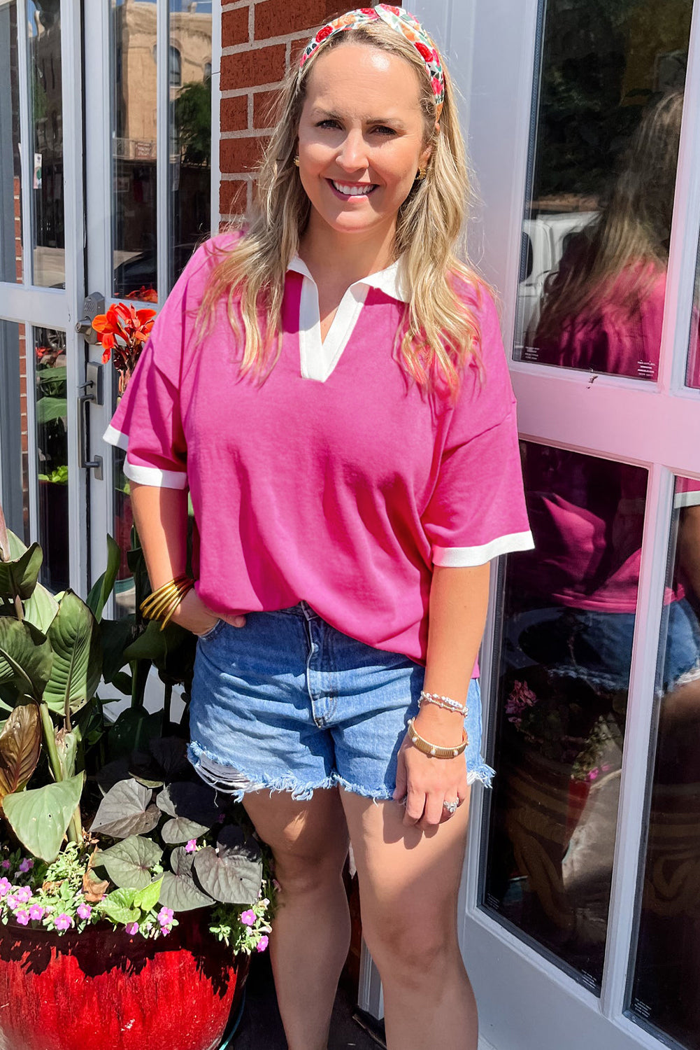 Pink Contrast Trim Collared Split Neck Short Sleeve Plus Size Top