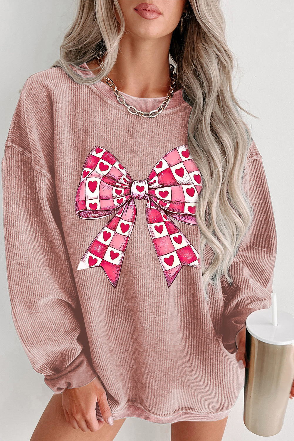 Pink Valentines Heart Checkered Bow Pattern Corded Baggy Sweatshirt