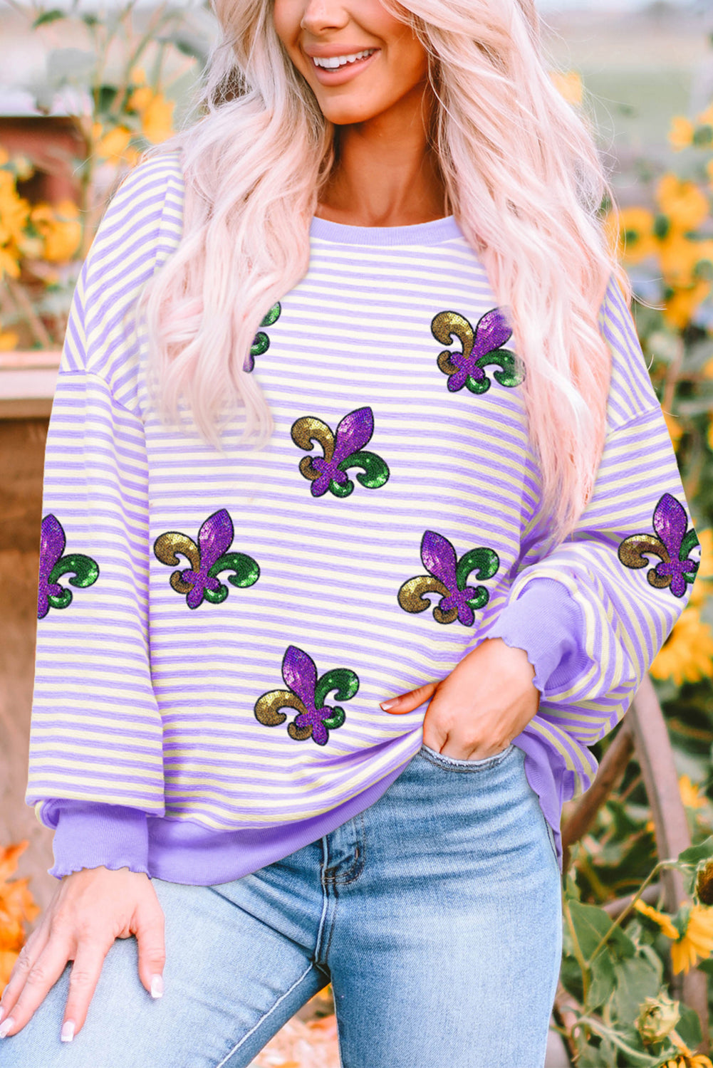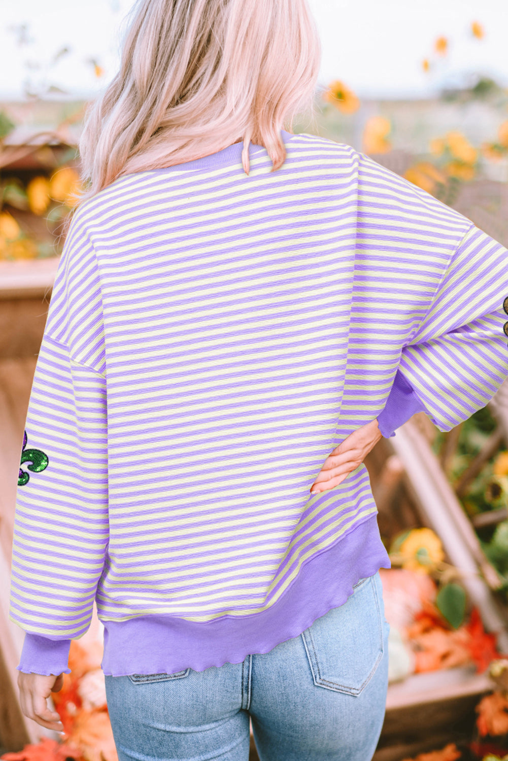 Purple Stripe Sequin Fleur De Lis Patched Drop Shoulder Long Sleeve Top