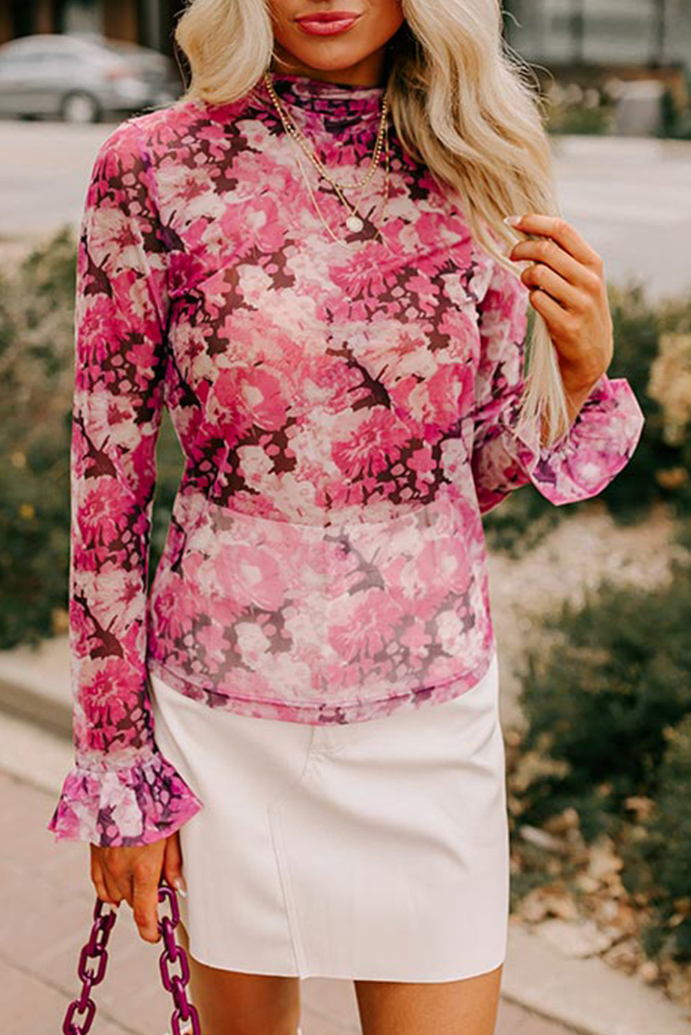 Rose Floral Mesh Flounce Sleeve Mock Neck Blouse