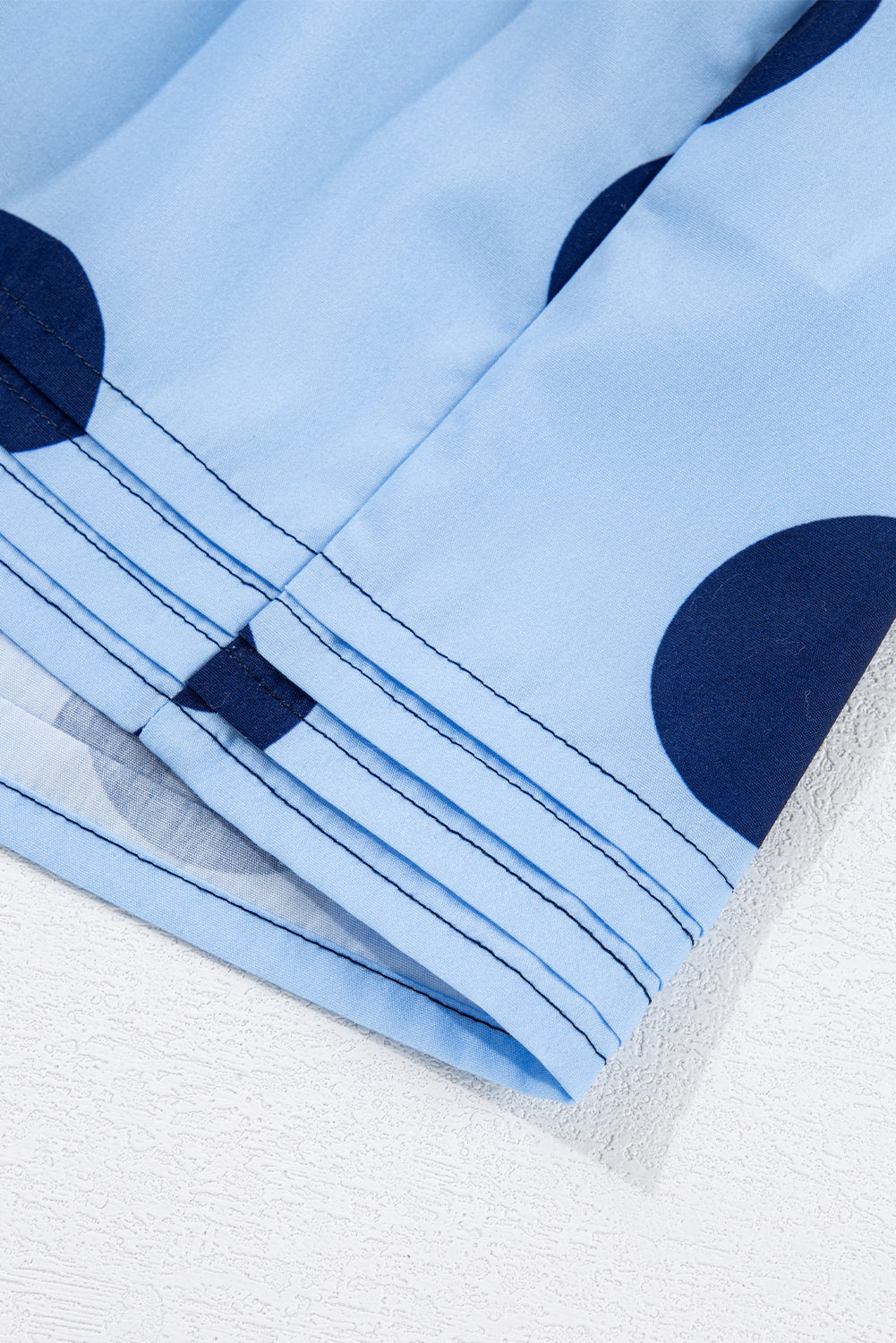 Sky Blue Polka Dot Print Ruffled Short Sleeve Buttoned Collared Blouse